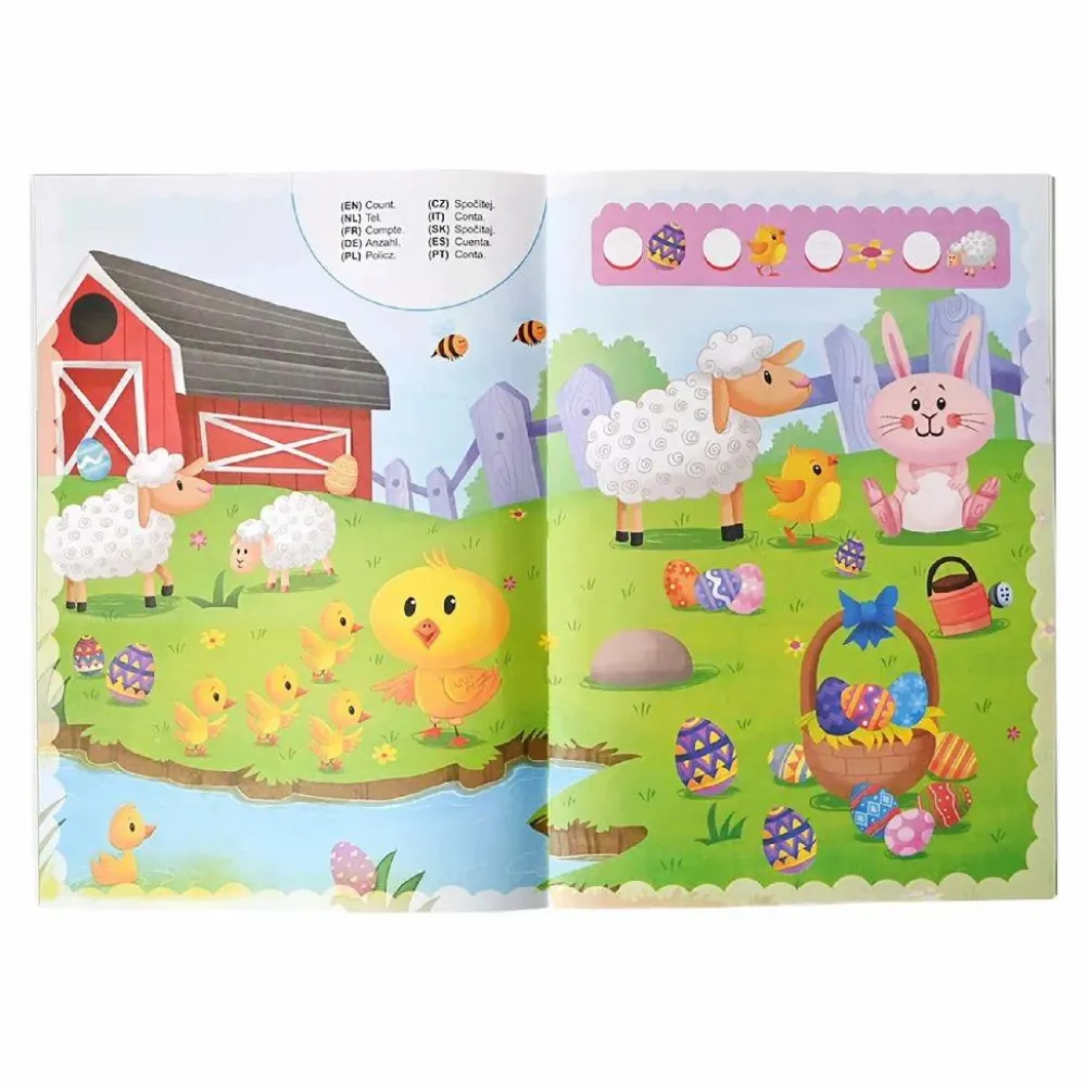 Malebog, aktivitetshæfte og klistermærker i samme hæfte på 44 sider.