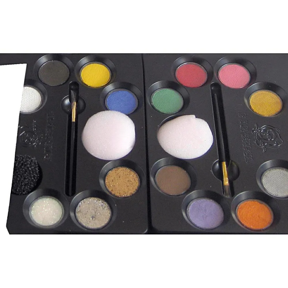 Virkelig lækkert sæt med 12 farver ansigtsmaling inkl fin glitter.
