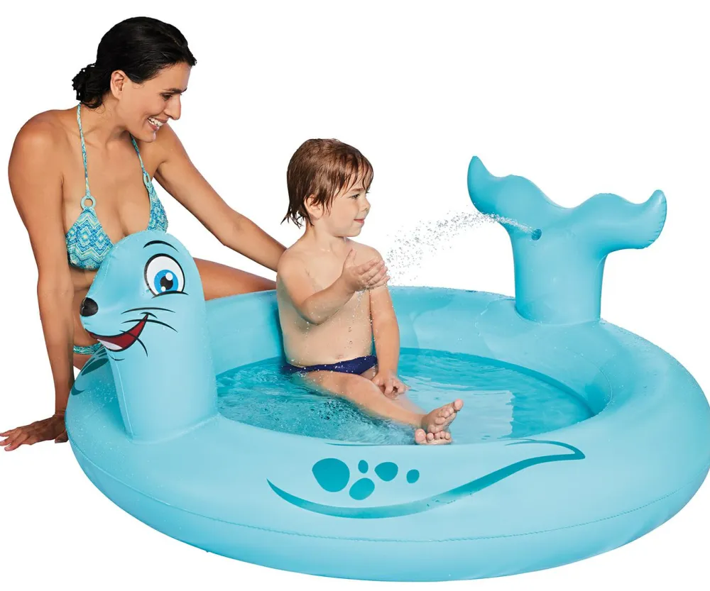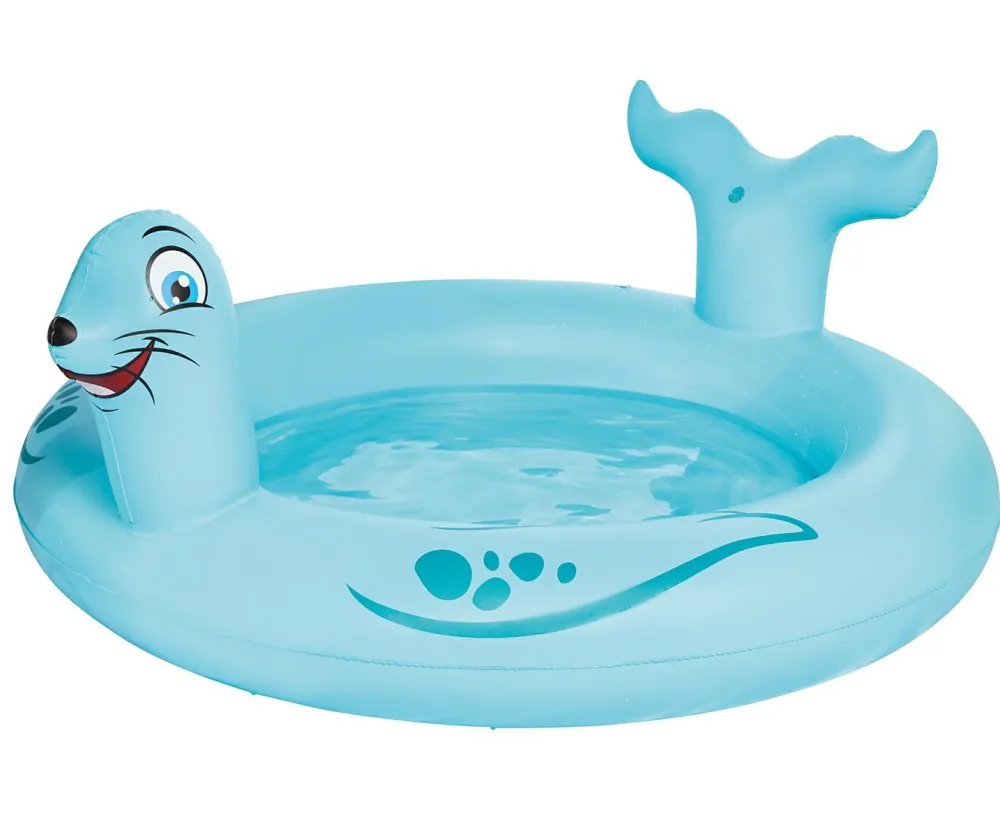 Dette fine badebassin til ungerne har den ekstra funktion, at du kan slutte haveslangen til bassinet. Så kan søløven sprøjte vand ud af sin halefinne. Til stor fryd og fornøjelse for sommervarme små vandhunde.