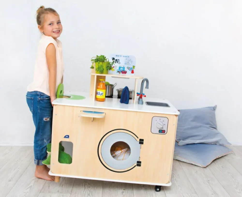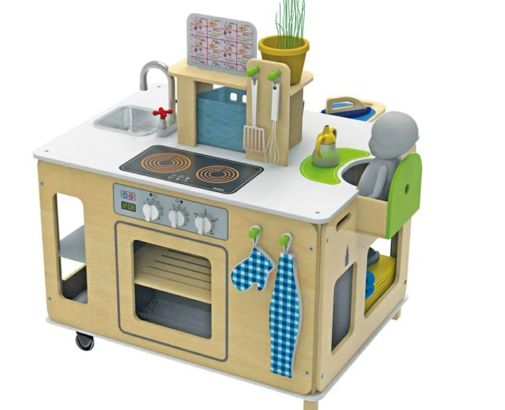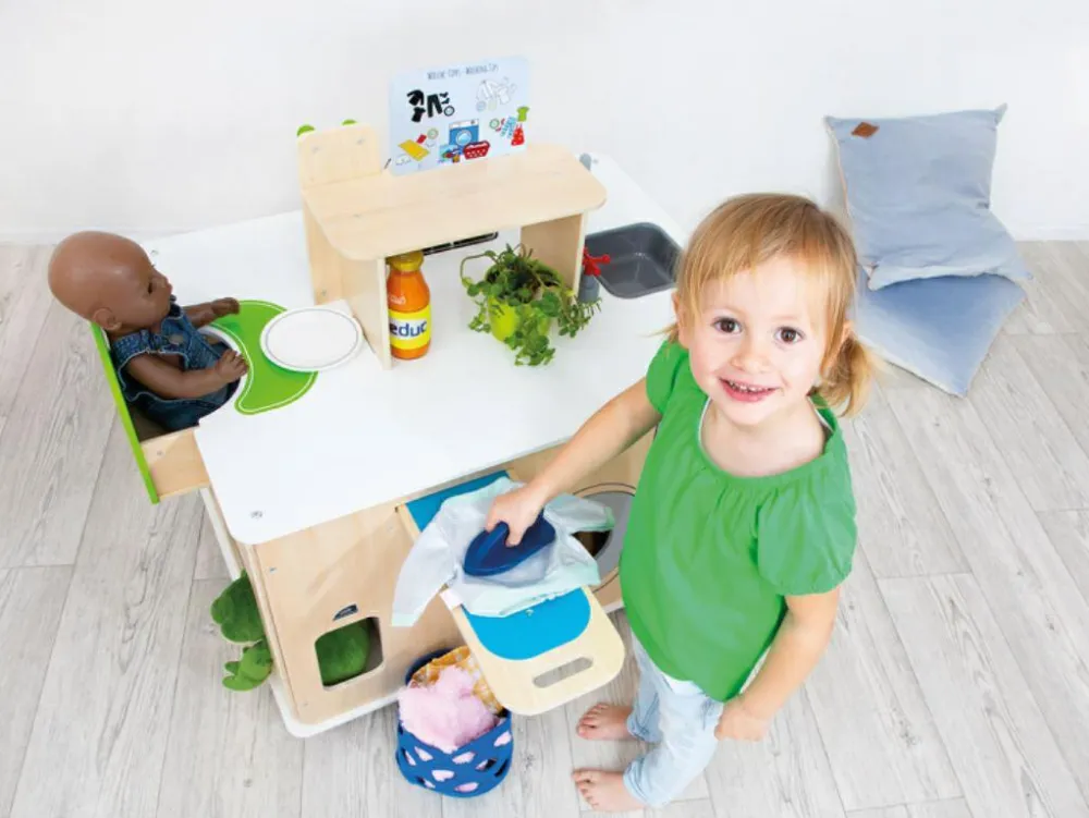Lad dit barn lave mad i den hyggelige kogekrog med varmeplader og ovn og følg opskrifterne på de sjove kort. Dukken kan sidde i den træk-ud højstol og blive passet og plejet. Lad dit barn prøve at stryge og vaske i det smarte stryge- og vaskeområde med strygejern og træk-ud strygebræt. Og selvfølgelig holde det hele rent og ryddeligt med vasken og affaldsspanden.