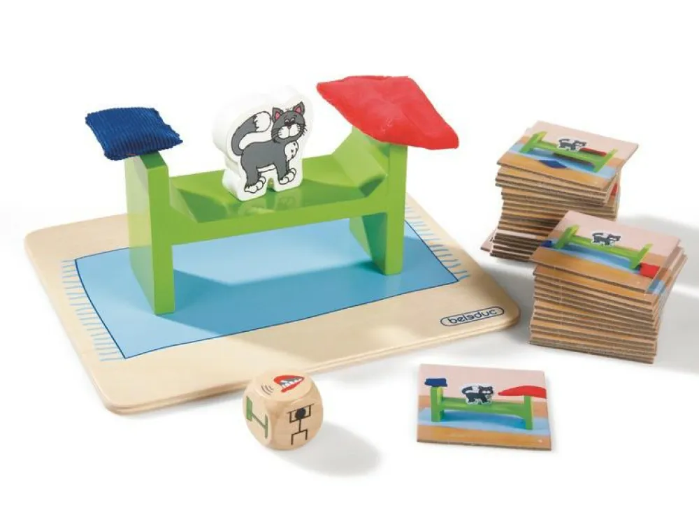 Dit barn udvikler sproglig forståelse om forholdsord såsom over, under, ved siden af og ovenpå, mens I hygger med spillet om den frække kat.