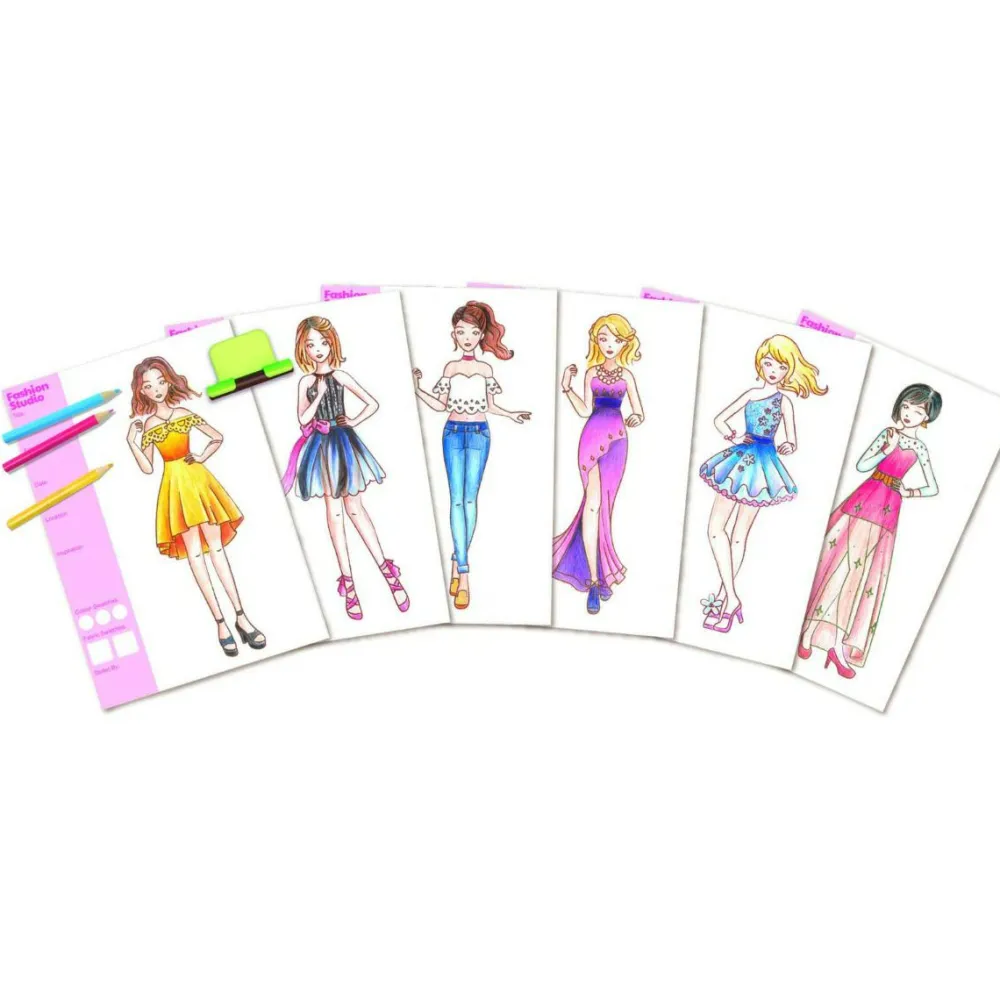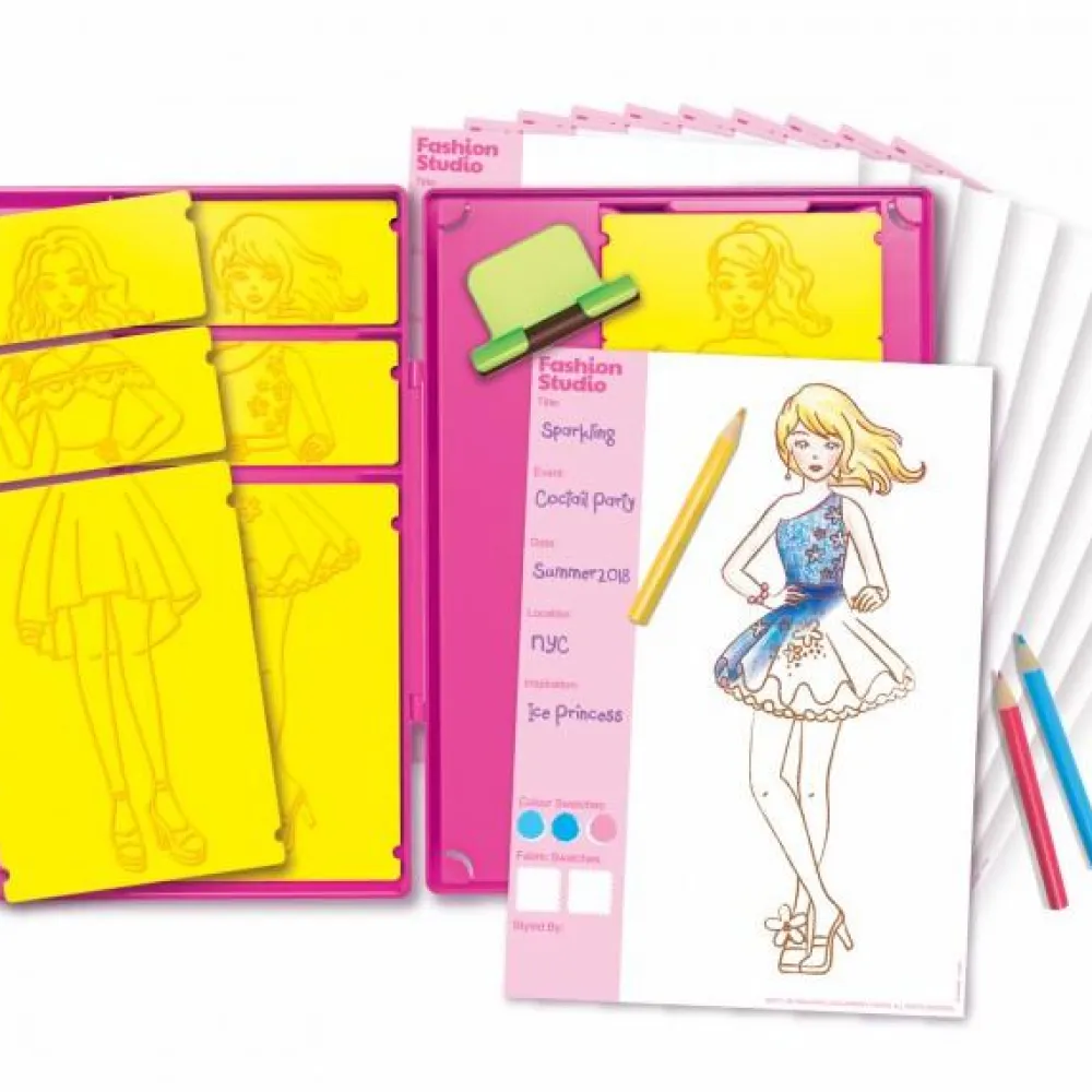 Nu kan dit barn nemt lege designer og sammensætte sine egne outfits. Skift de forskellige gnideplader med hoved, overkrop og underkrop og vælg, om modellen skal være iført en top med skrå skulder eller symmetrisk design, og om humøret er til bukser, lang nederdel eller måske nederdel med strut.