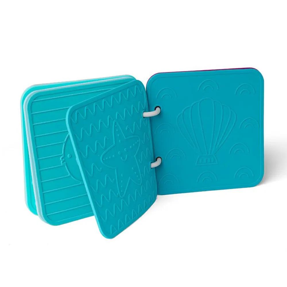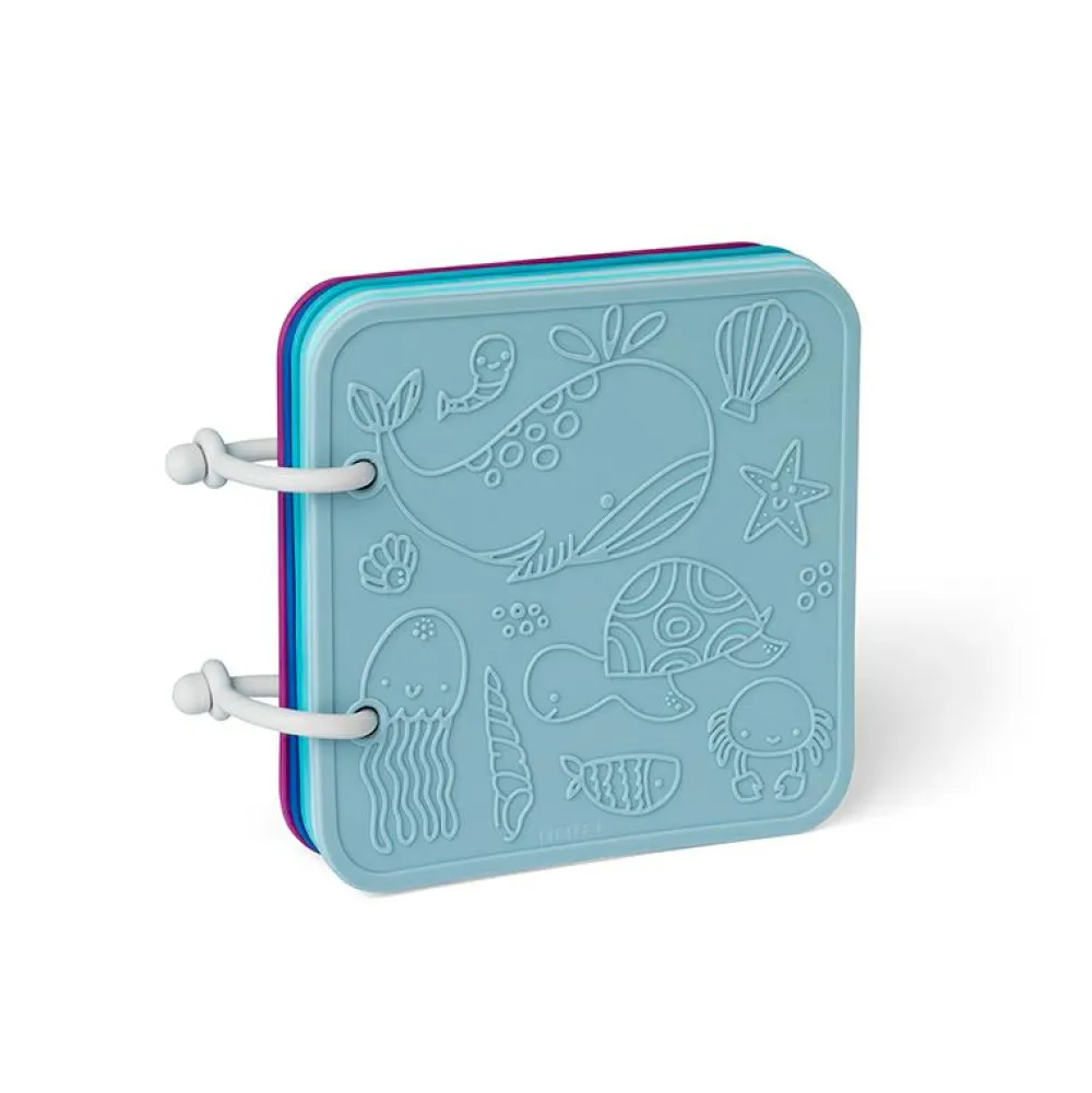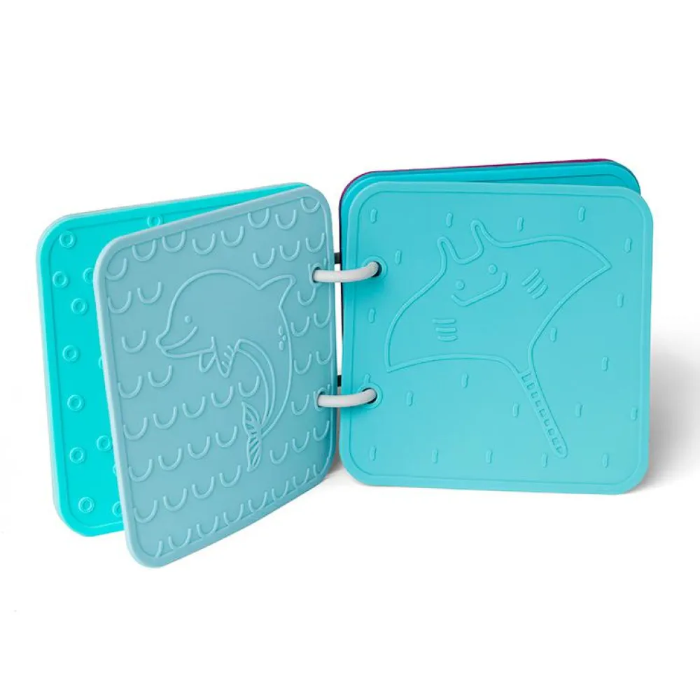 Fin badebog i blå nuancer med sider, der er nemme at vende og fulde af havdyr.