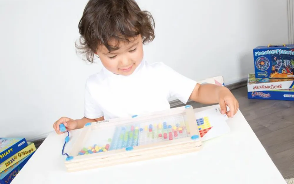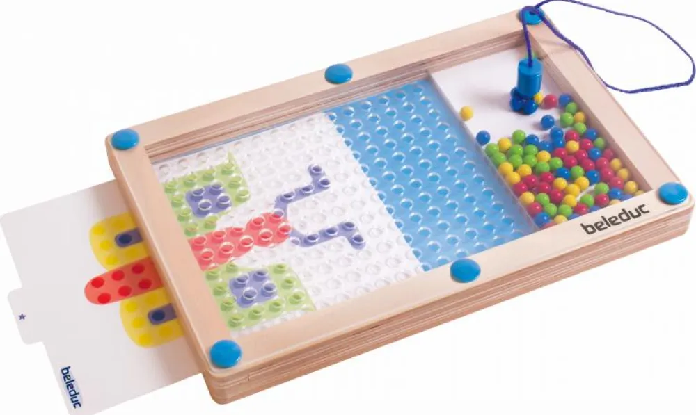 Det gælder om at fiske de rigtige farver kugler op med den magnetiske pind, så man kan kopiere mønstret fra opgavekortene.