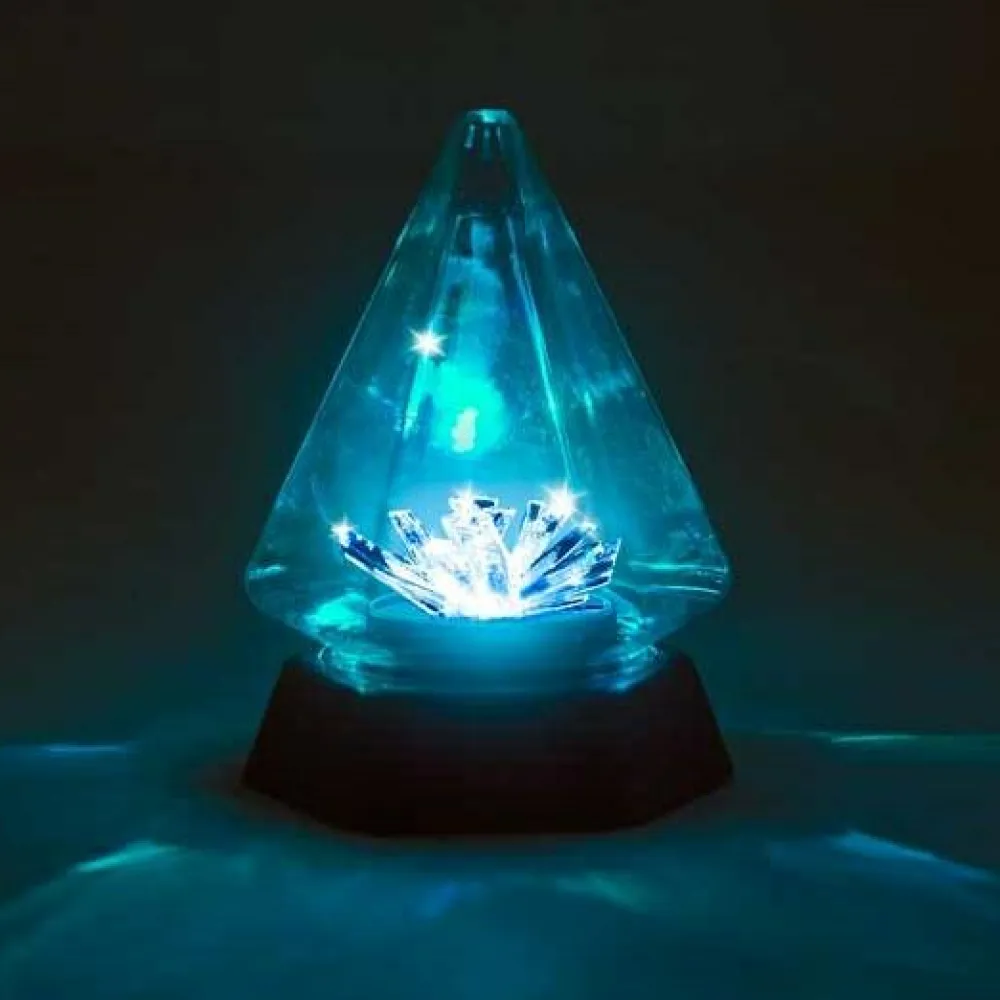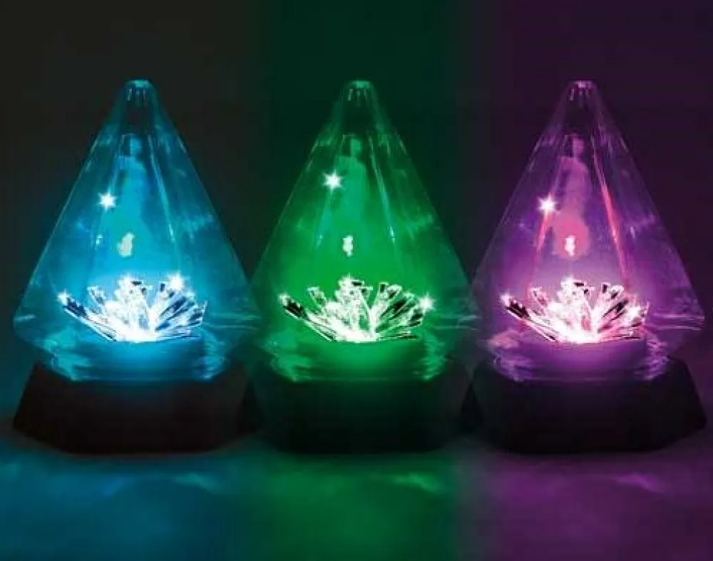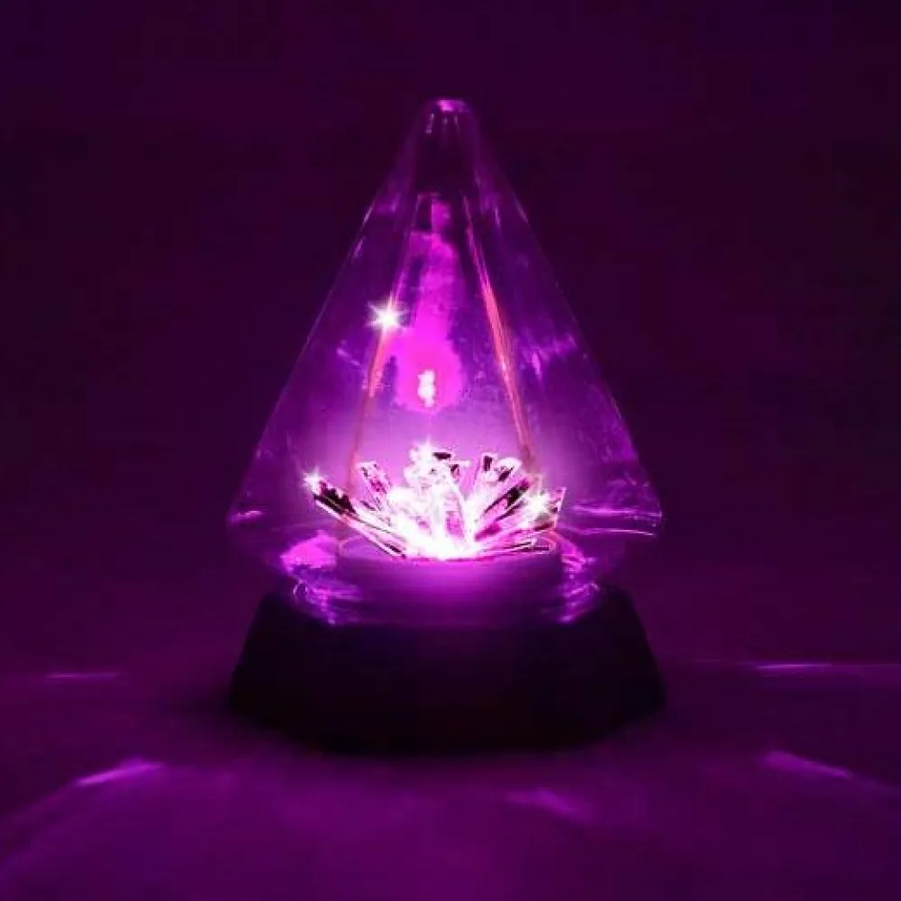 Når krystallen er færdig, kan den placeres i pyramidelampen, som lyser den op med 7 forskellige farver.