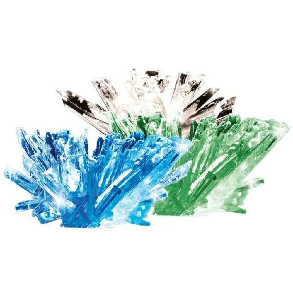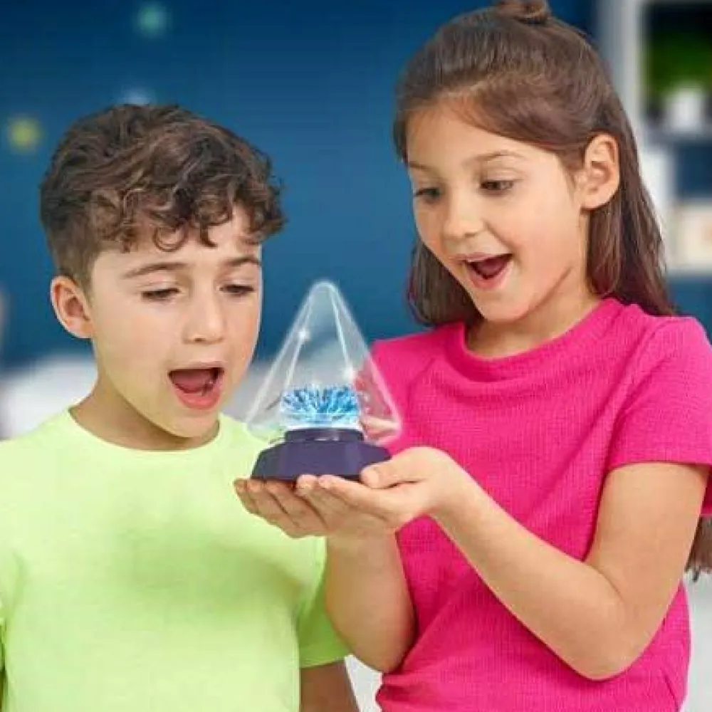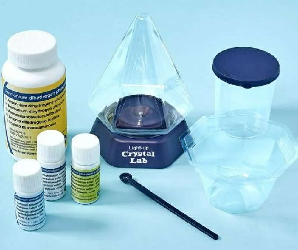 Sættet indeholder kemikalier til fremstilling af krystaller, en lysende pyramidelampe med LED-base, målekop med låg, ske og ottekantet beholder.