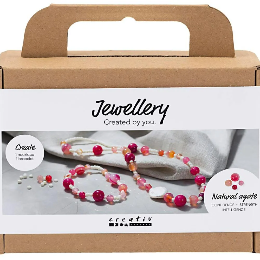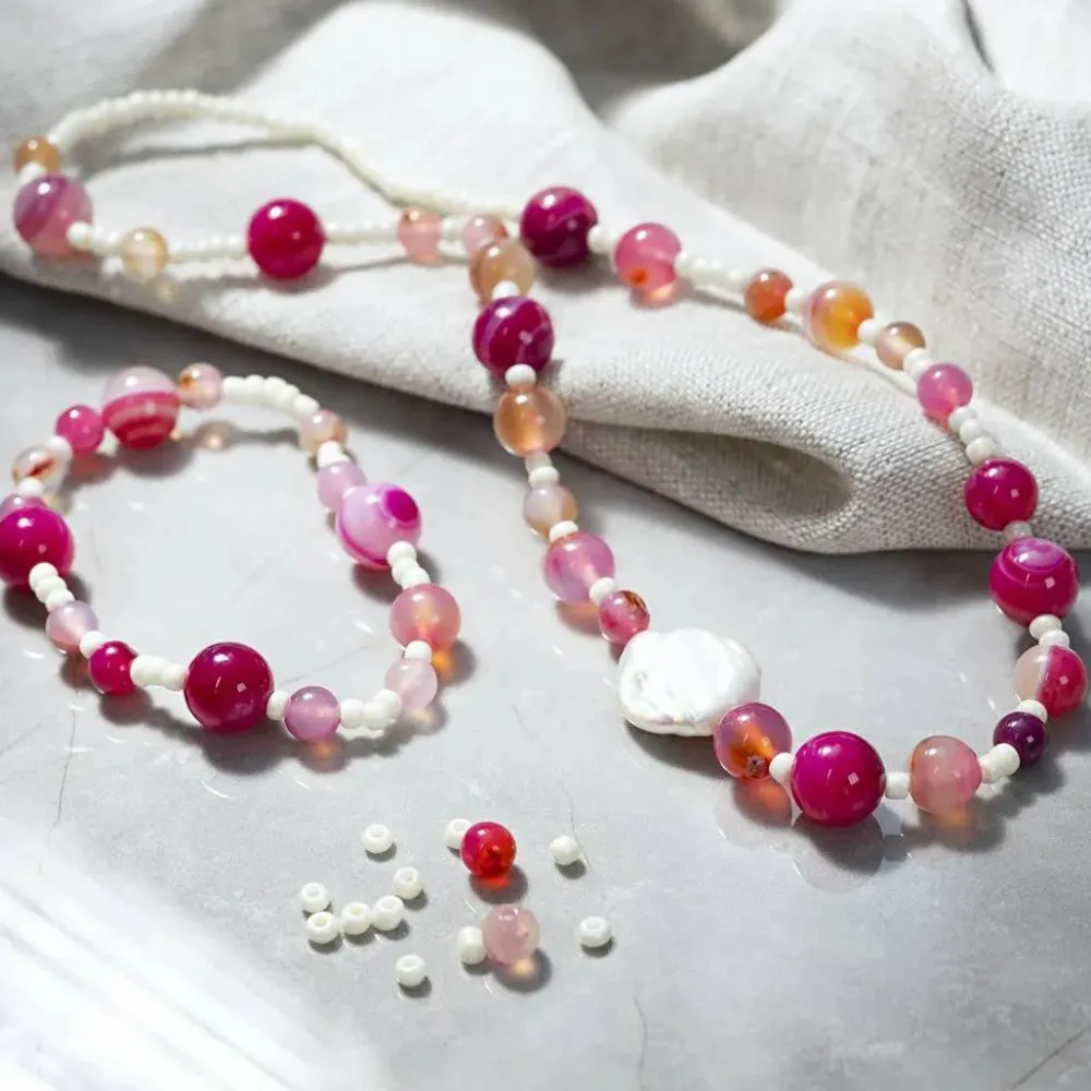 Kit med agater (halvædelsten), rocaiperler og en ferskvandsperle – nok til et sæt med matchende armbånd og halskæde.