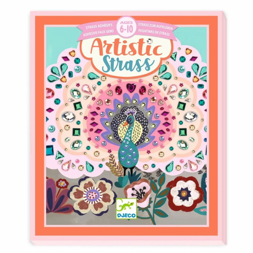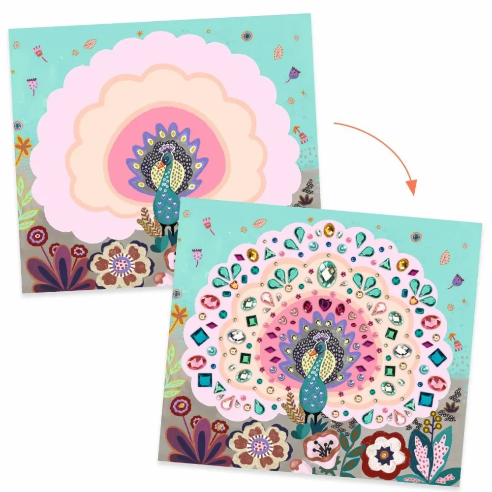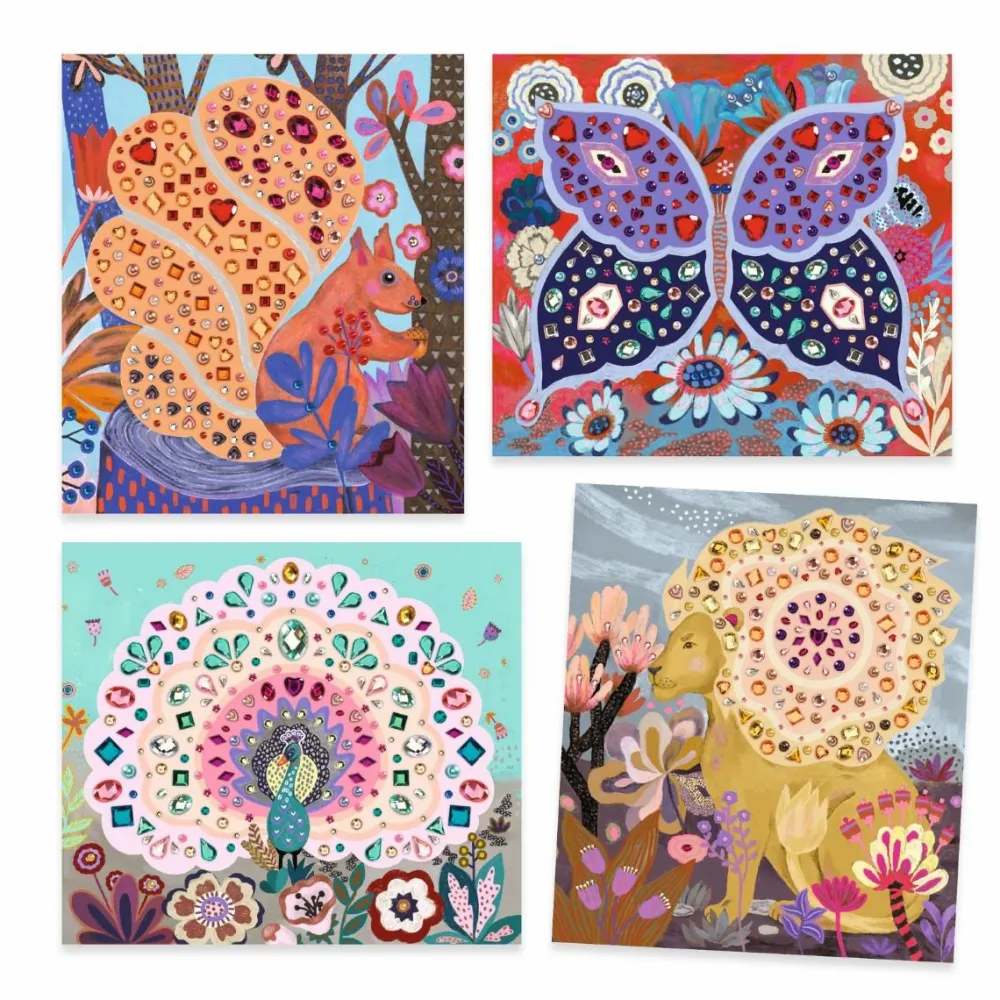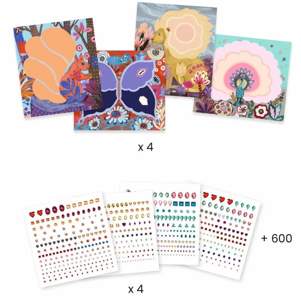 Her er 4 meget fine motiver, hvor dit barns kreative opgave er at placere de 600 glitrende og selvklæbende sten så pynteligt som muligt.