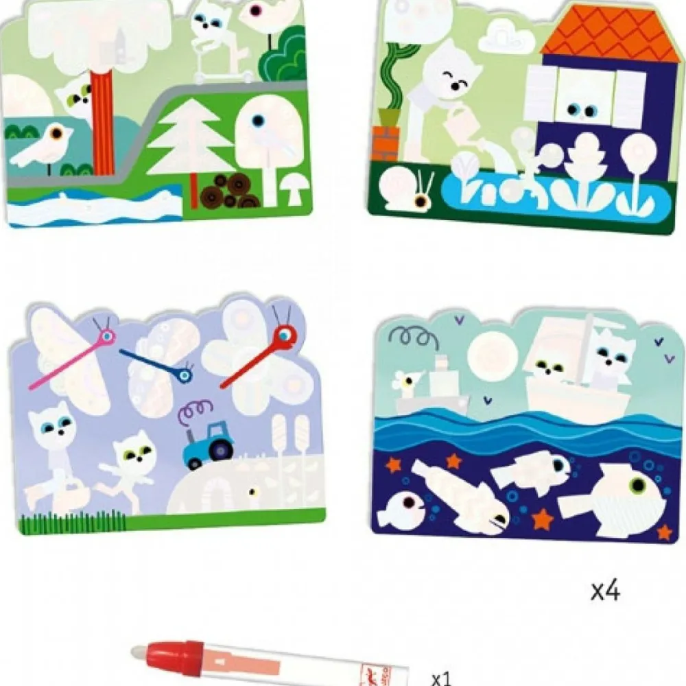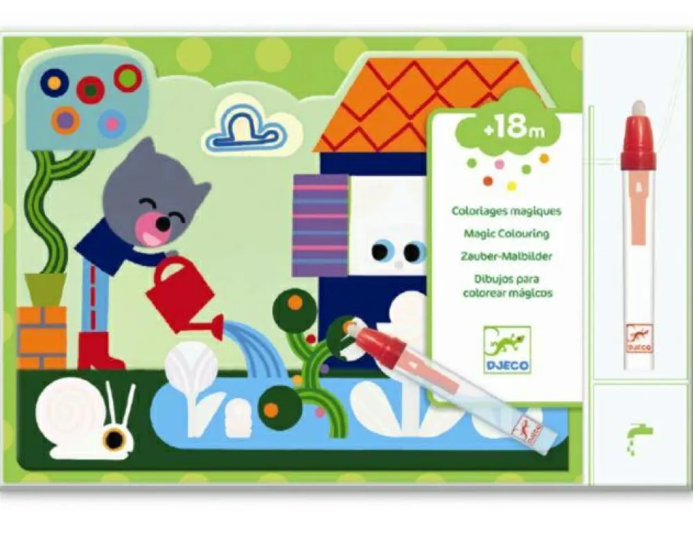 Her er 4 flotte billeder med finurlige motiver fra bl.a. en herlig have. Fyld vand i den medfølgende pen, og lad så barnet “tegne” på motiverne med pennen. Når de hvide felter bliver fugtige, kommer de flotteste farver frem og vækker det hele til live.