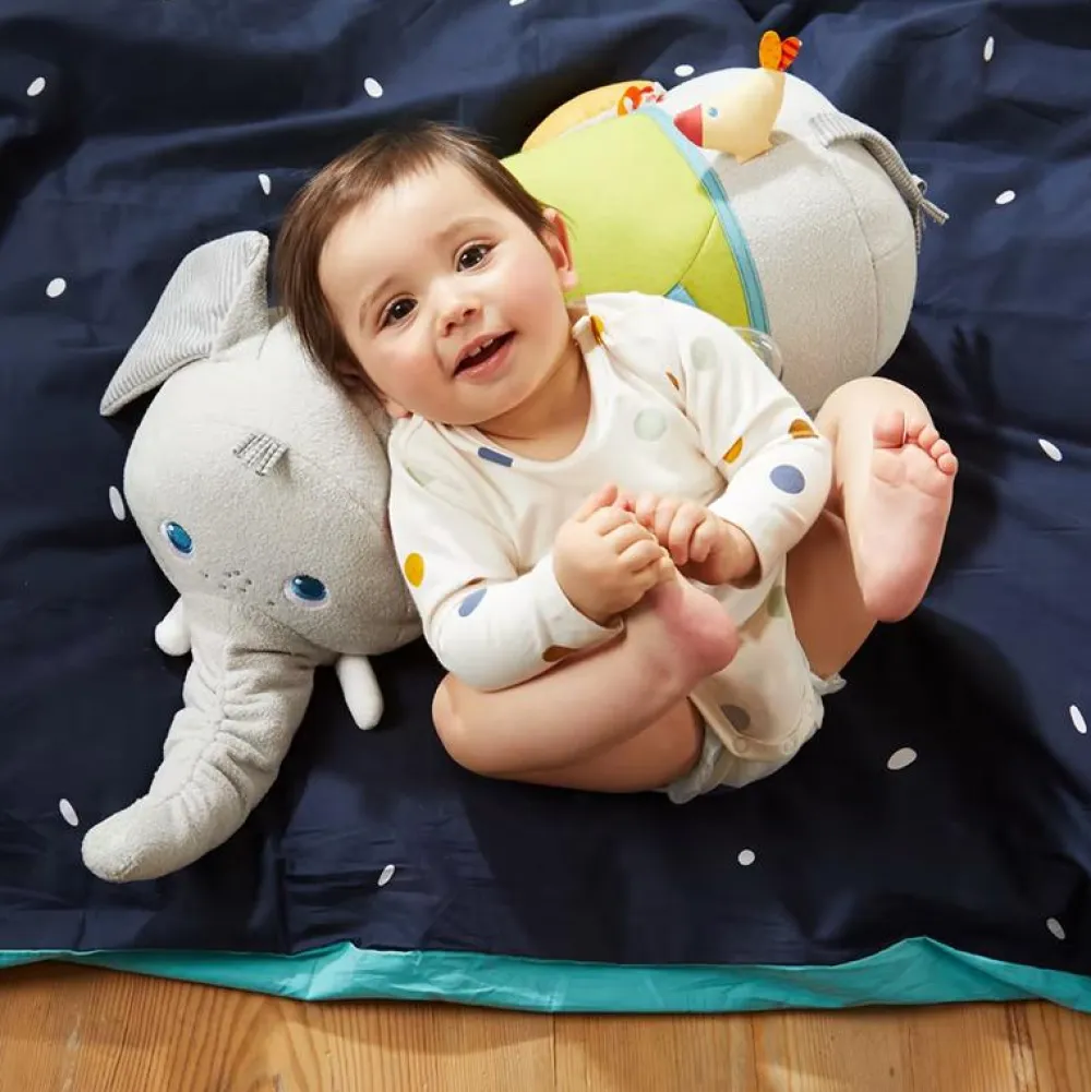 Denne bløde og farverige elefant er en sand fornøjelse for dit barns sanser. Den er ikke bare dejlig at røre ved, men også fyldt med en masse små overraskelser, der vil holde dit barn engageret. Fra den bløde kravlerulle, der er perfekt til at udforske på maven, til de sjove og interaktive detaljer som en bevægelig hoved, raslende snabel og endda en lille fugl på ryggen, der piver, når man trykker på den.