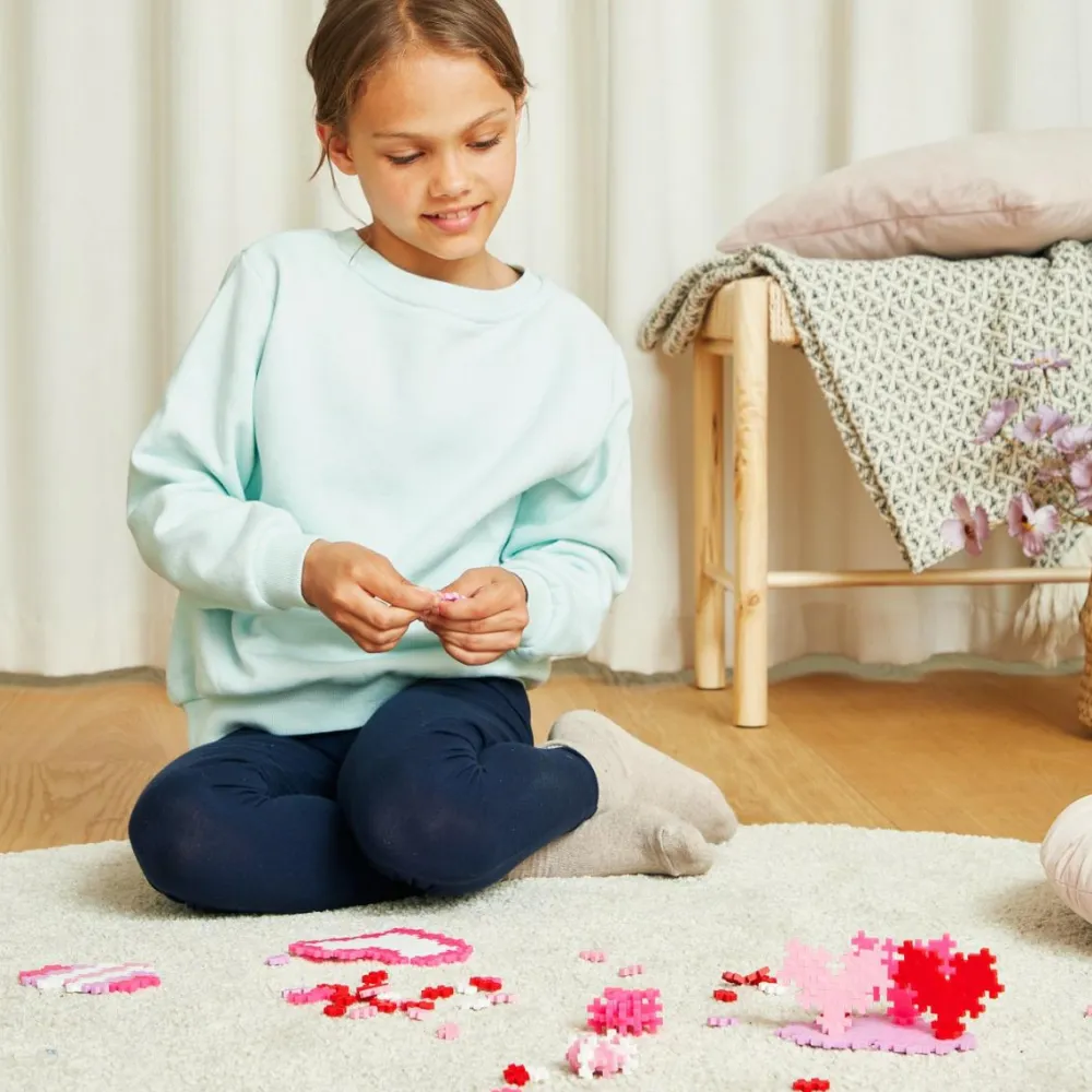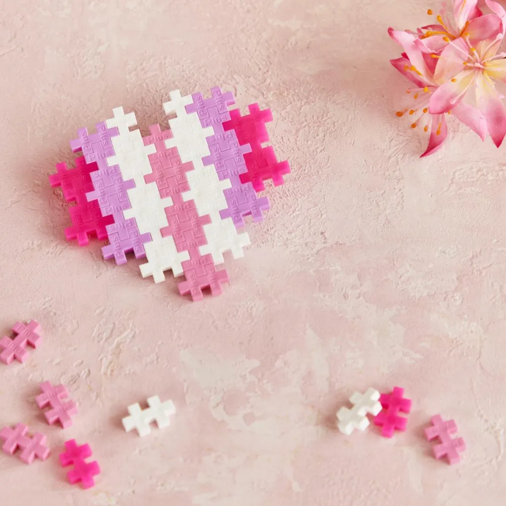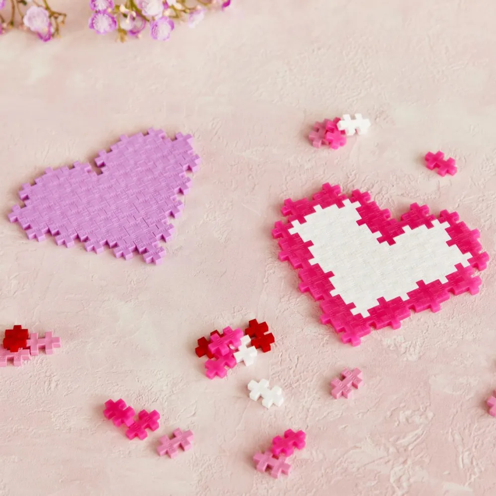 Sig det med Plus-Plus. Her er 240 af de små brikker som kan formes til hjerter – eller til lyserøde monstre.