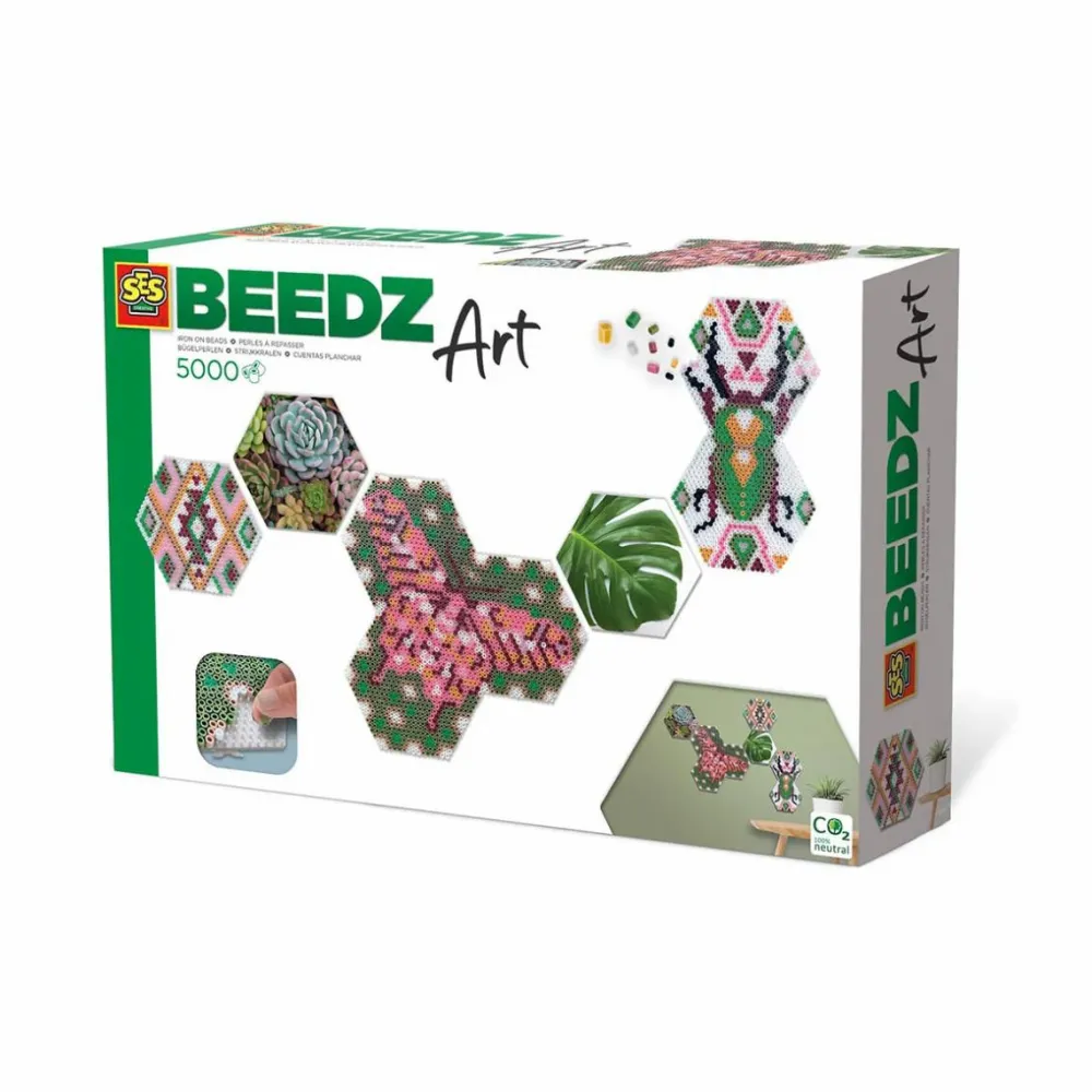 Her får du 5000 perler, 3 sekskantede perleplader, klistermærker og to skumplader at hænge de færdige værker op på væggen på.