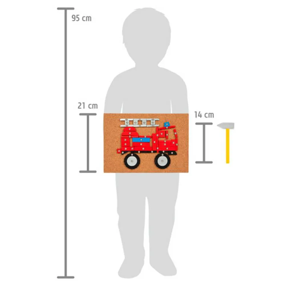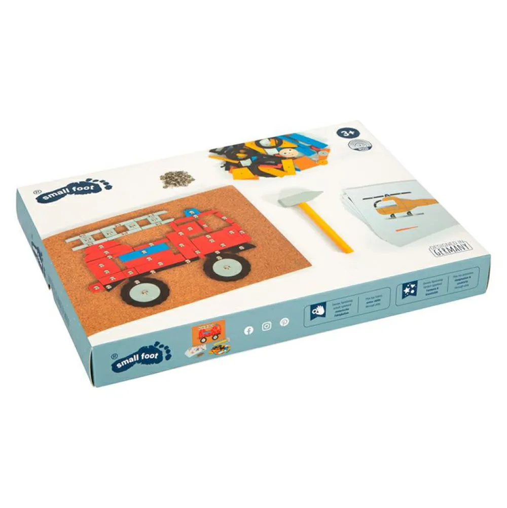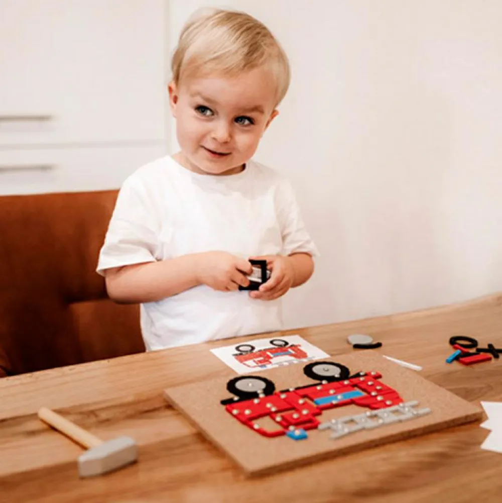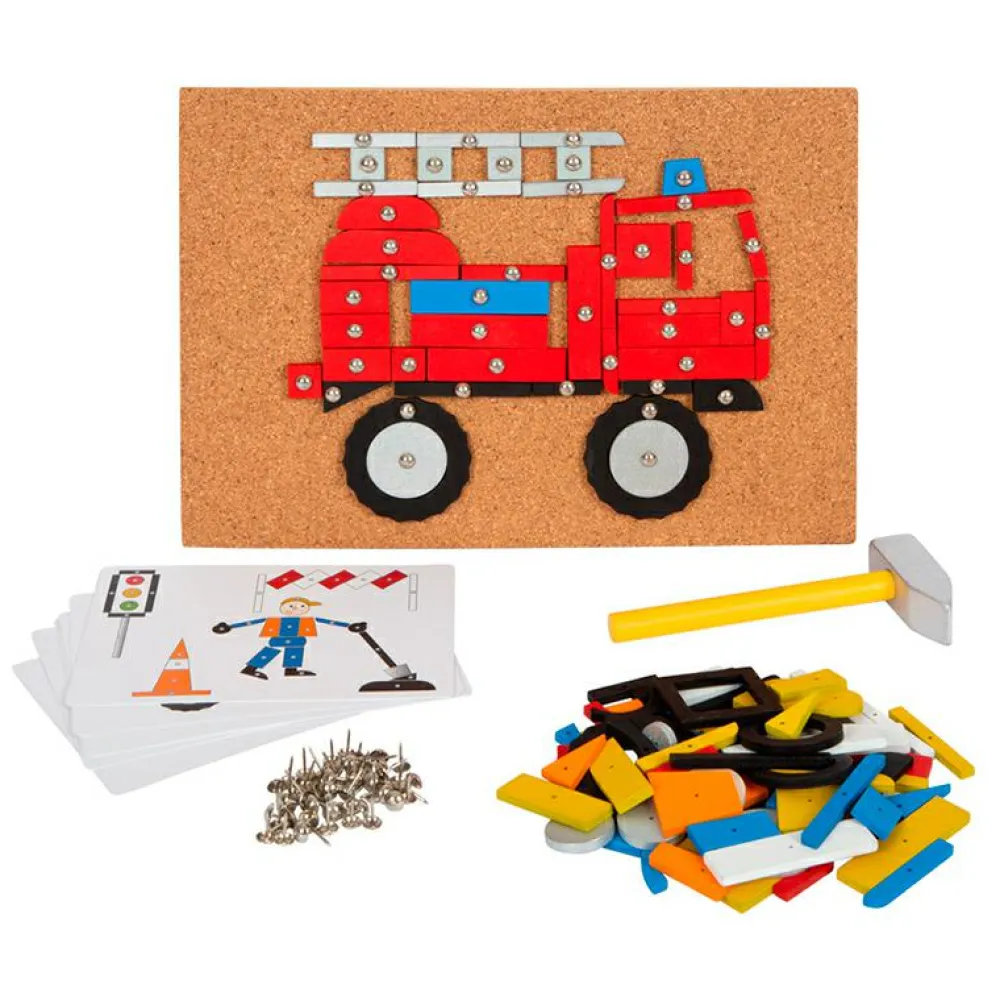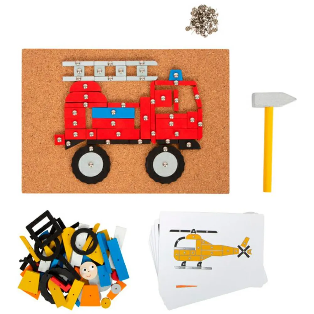 Skønt mosaiksæt med skabeloner, der hjælper dit barn i gang med at bygge køretøjer af små mosaikbrikker, der sømmes fast til en korkplade.