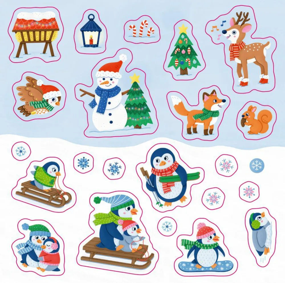 Lille pakke med tre baggrunde og ark med over 60 julehyggelige klistermærker.