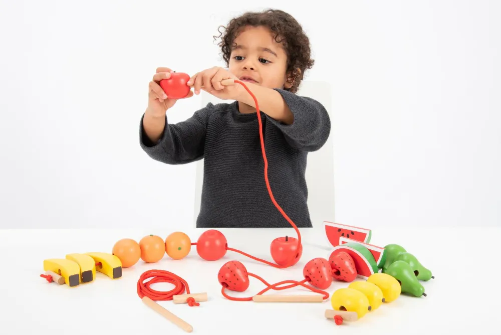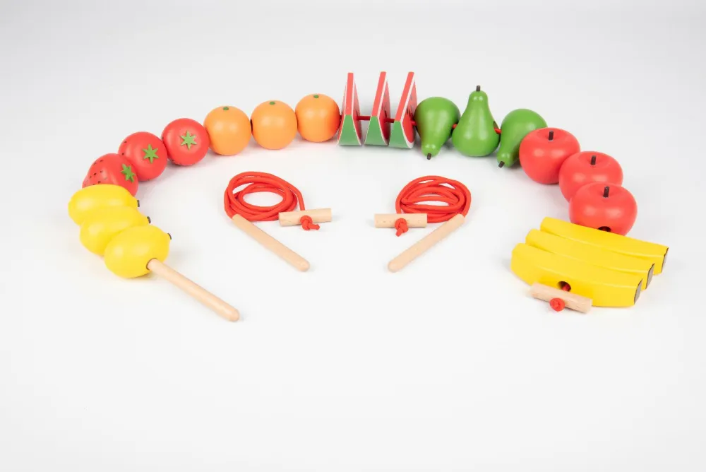 Med disse 21 store skønne frugter af træ, som kan trækkes på tykke snore, kan dit barn blive bedre til finmotorik og til at tælle. Der kan laves mønstre og man kan lege frugtsælger.