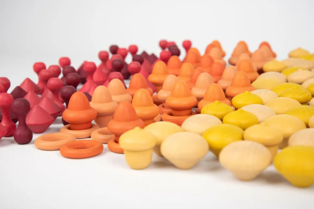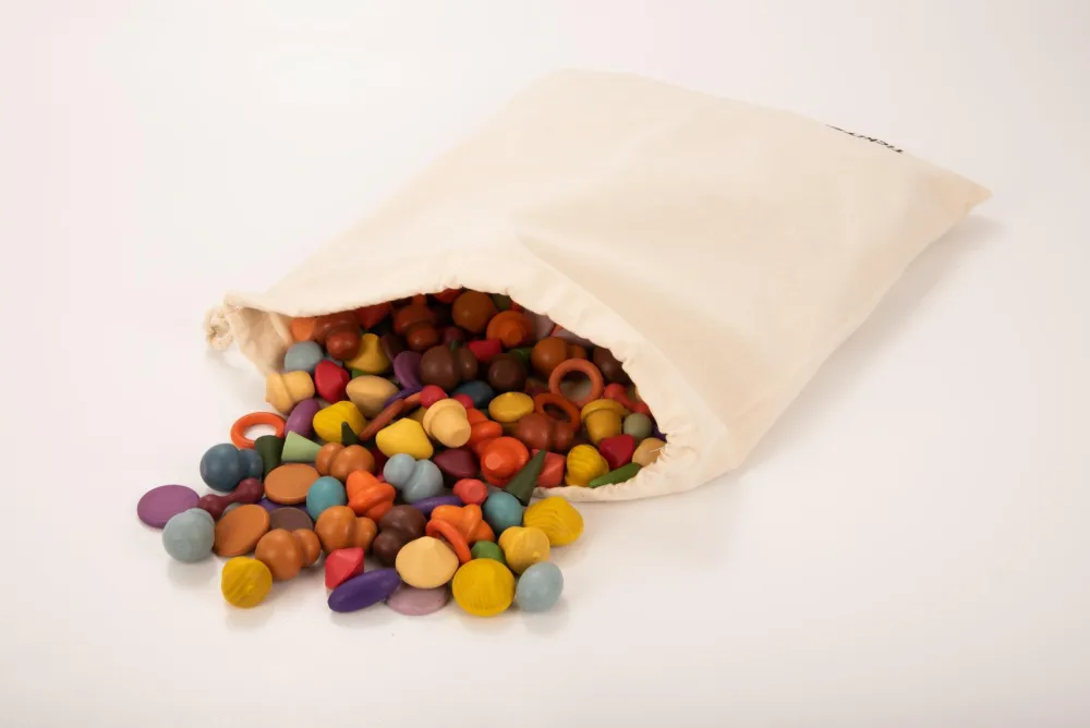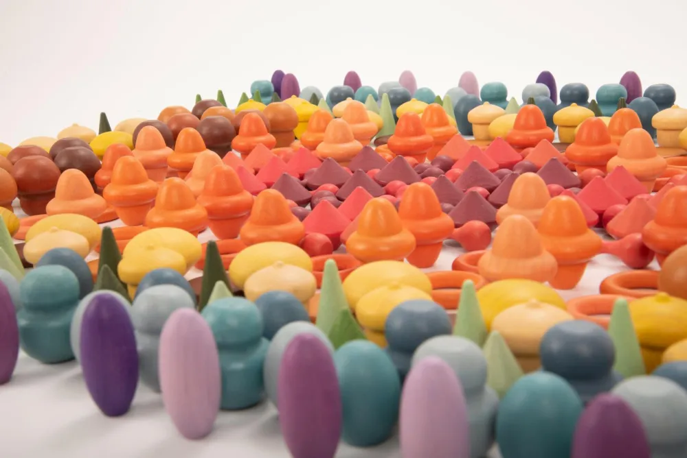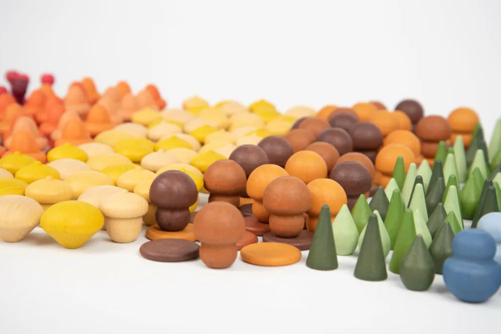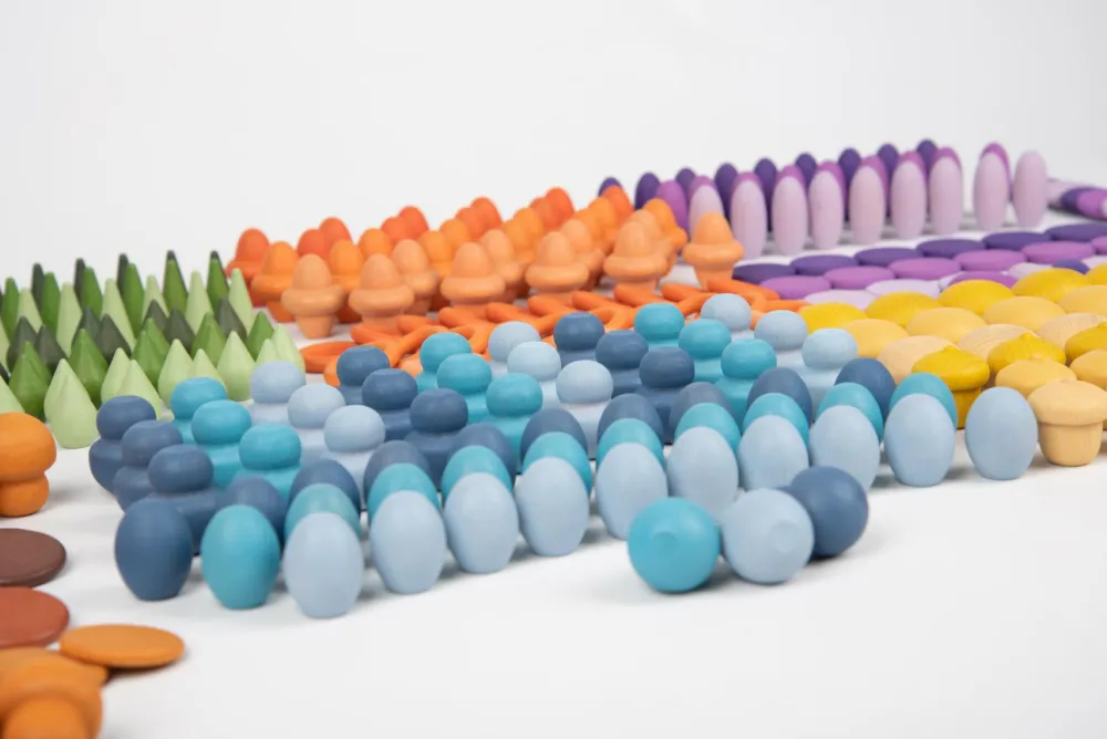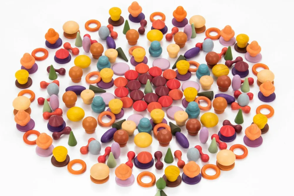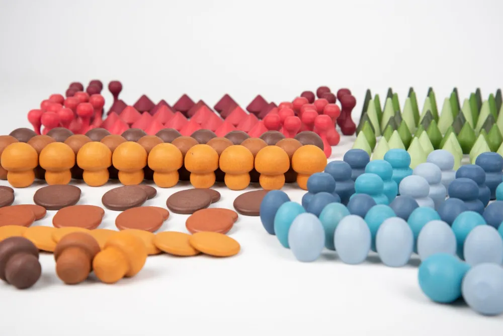 Kæmpestort sæt med 420 lækre træfigurer i organiske farver til alle mulige former for leg, læring og sortering.