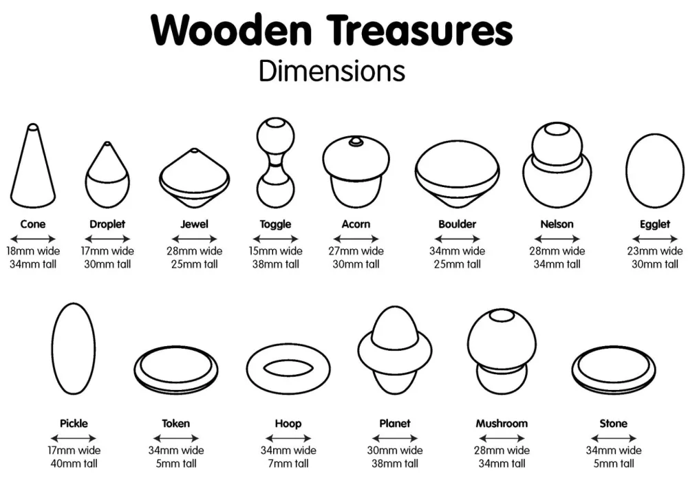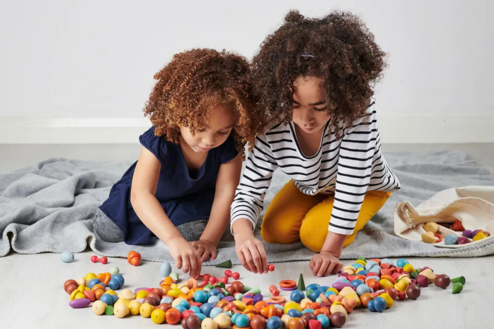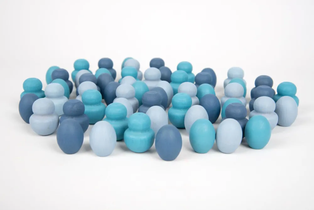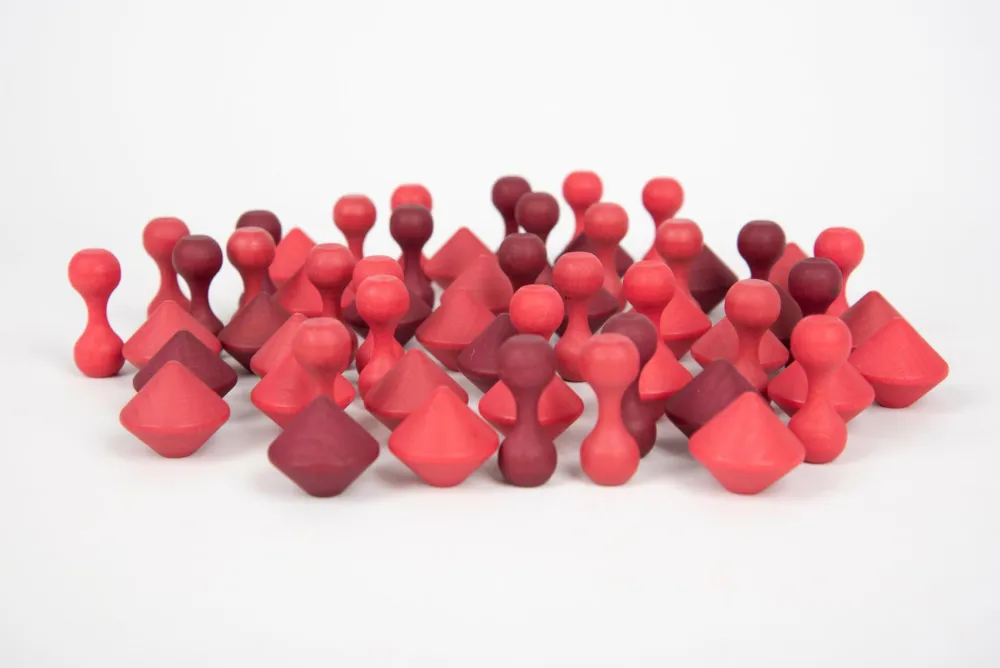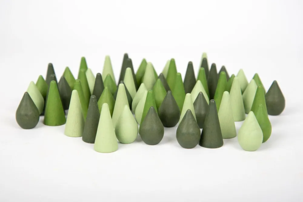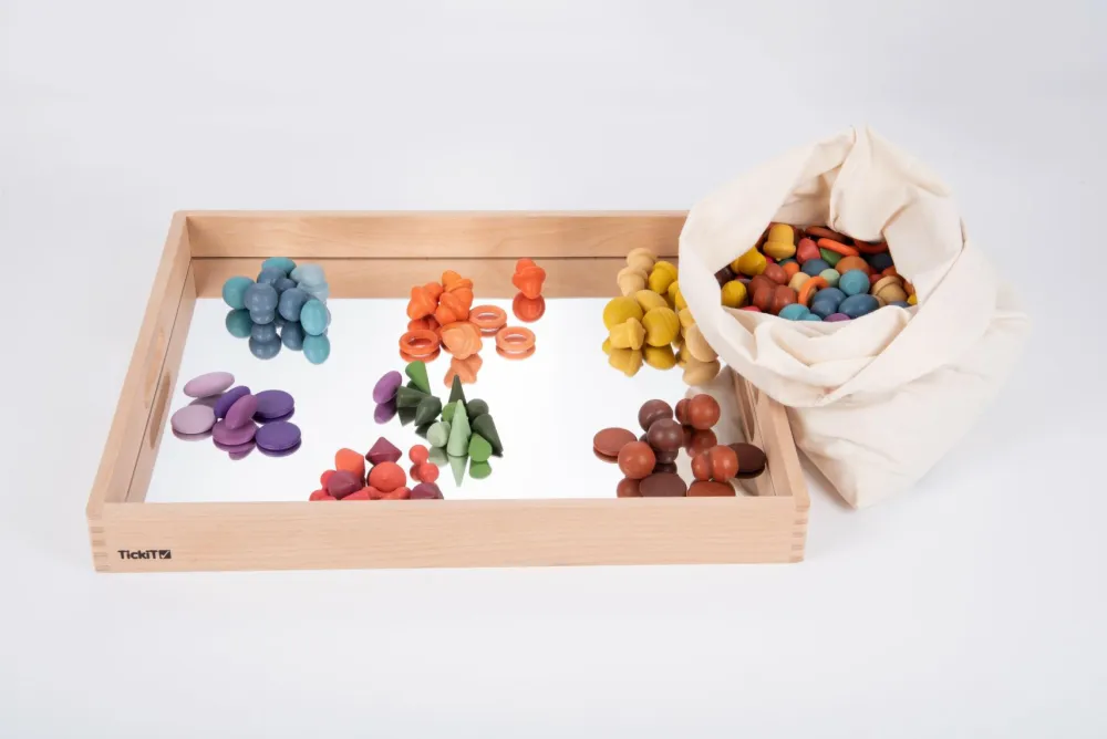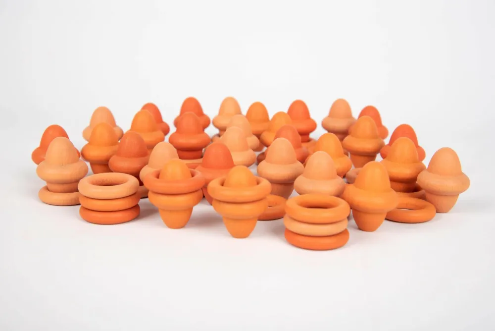 Kæmpestort sæt med 420 lækre træfigurer i organiske farver til alle mulige former for leg, læring og sortering.