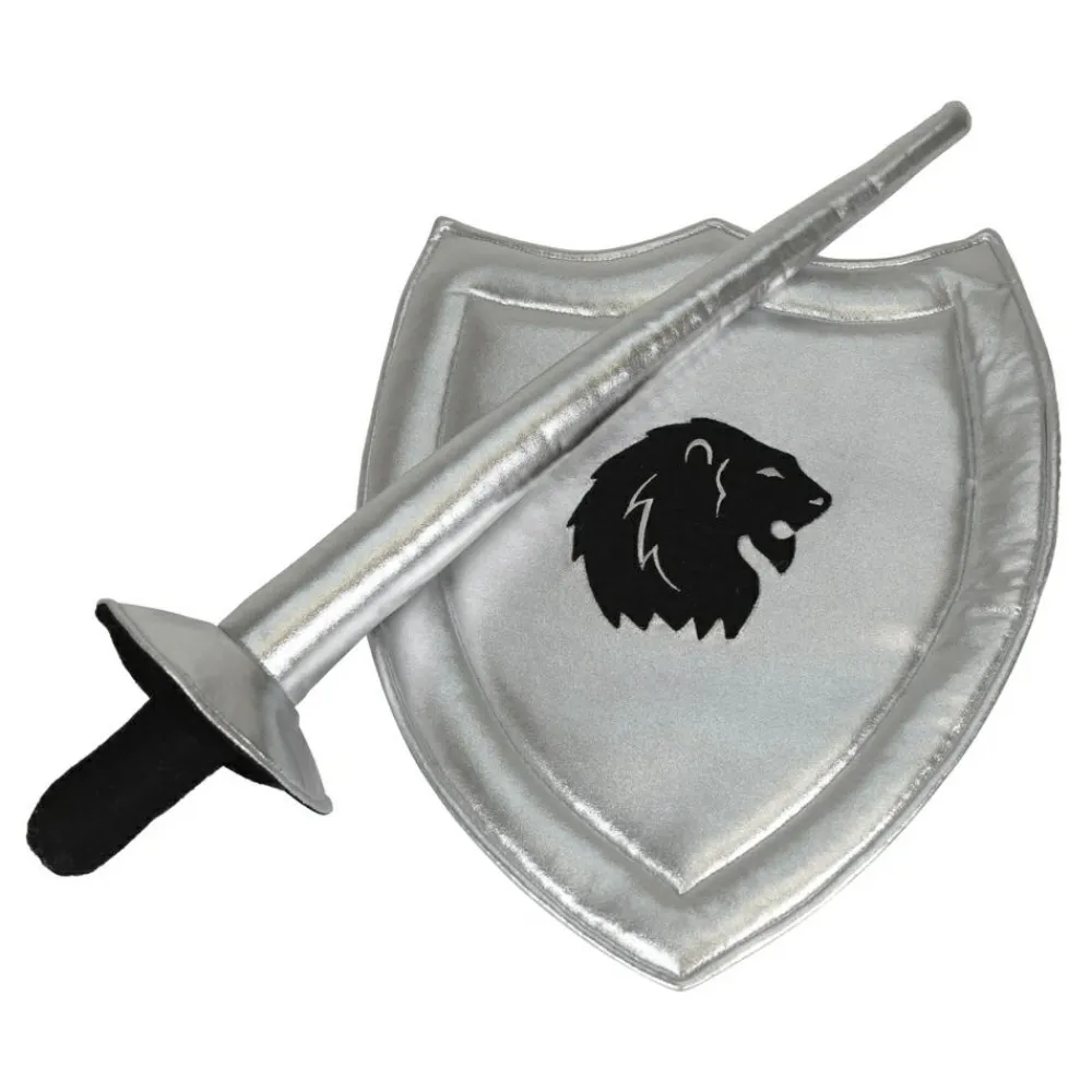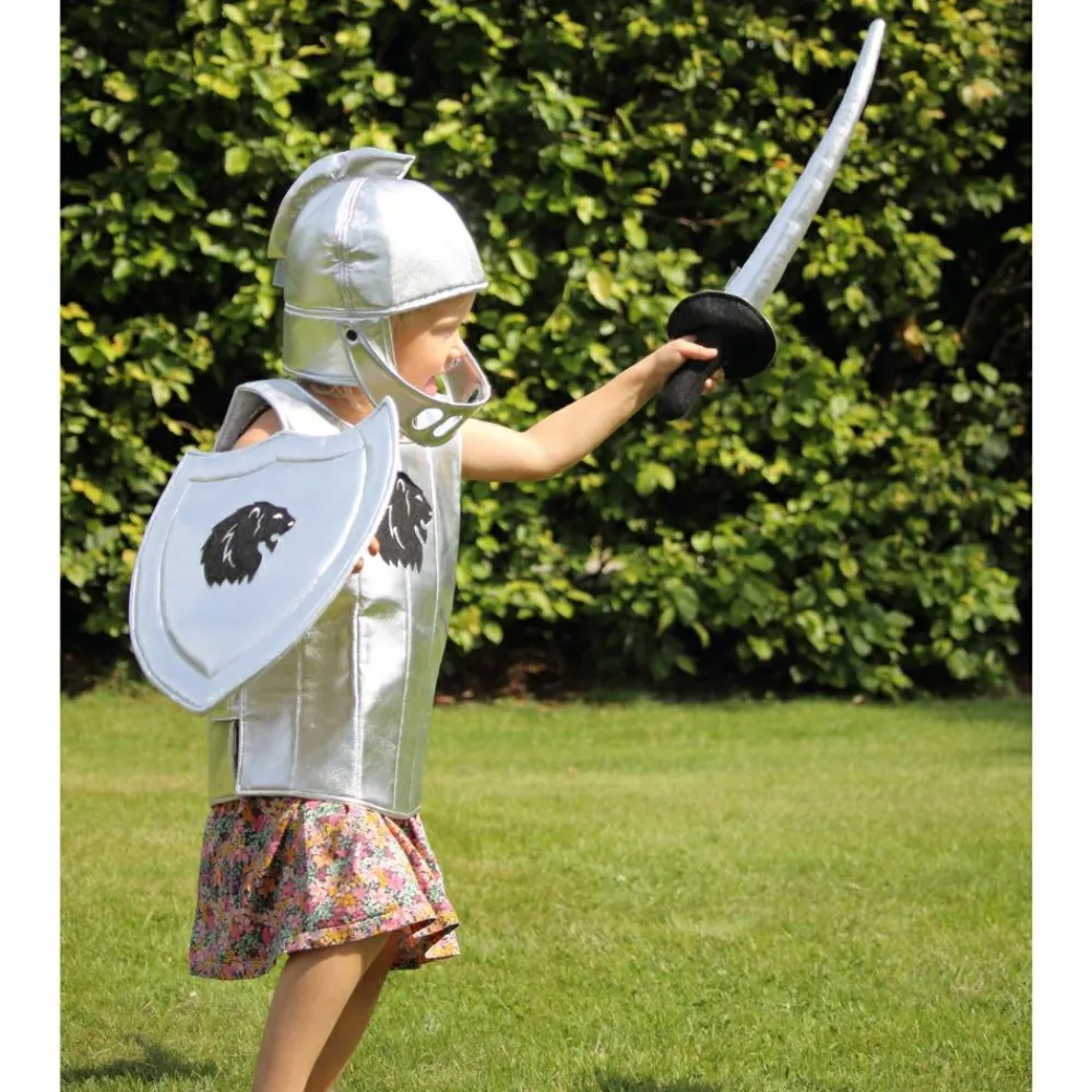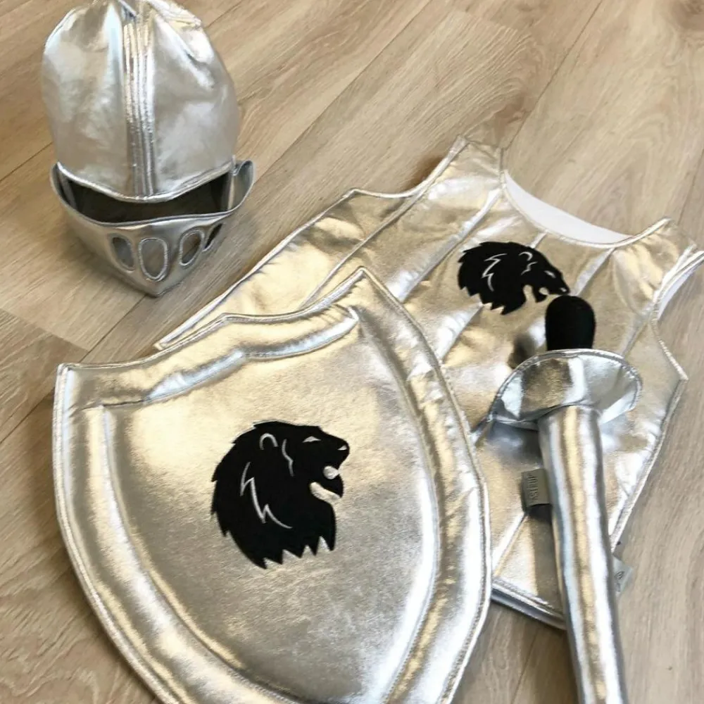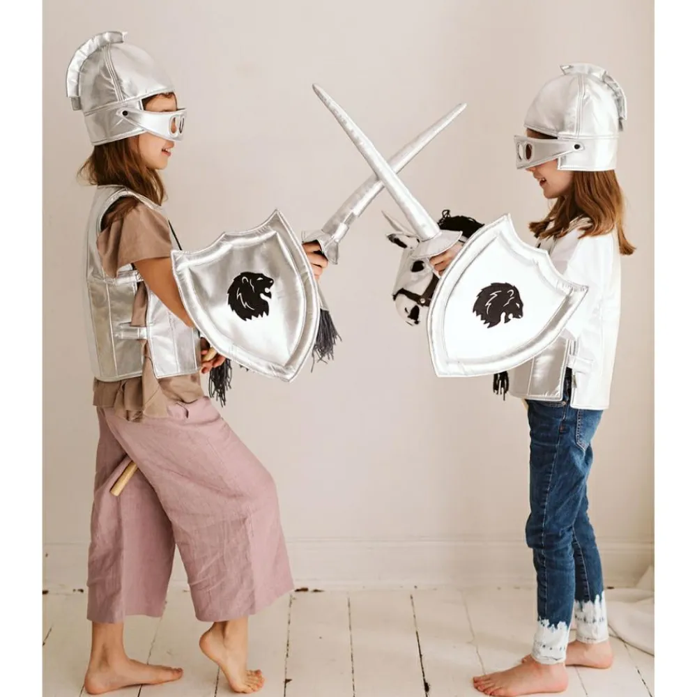 Træk i fuld ridder udklædning med matchende hjelm og rustning. Eller se, om skjoldet og lansen ikke er fint i sig selv til sjove eventyr, fægtekonkurrencer, farer nede i gården eller en god fastelavnsfest.