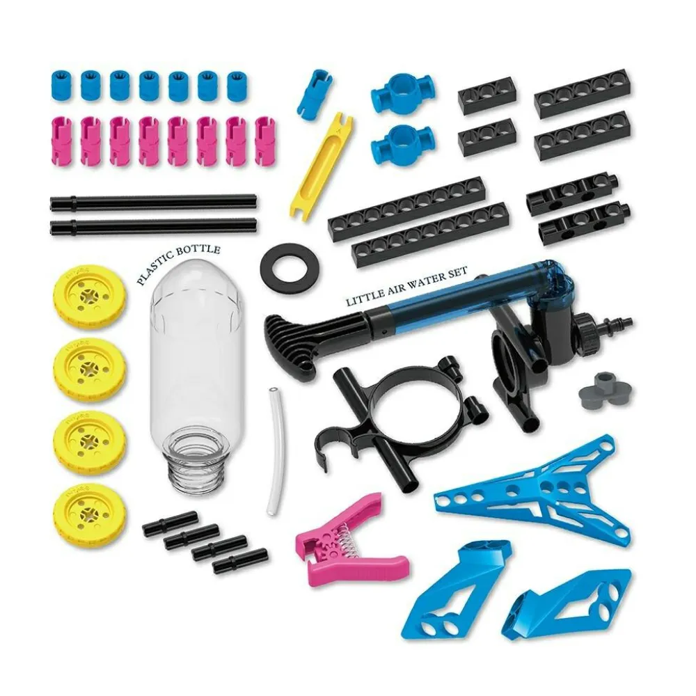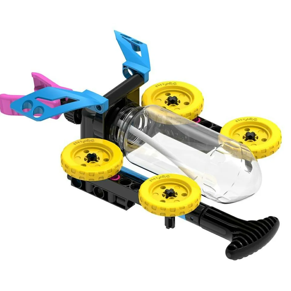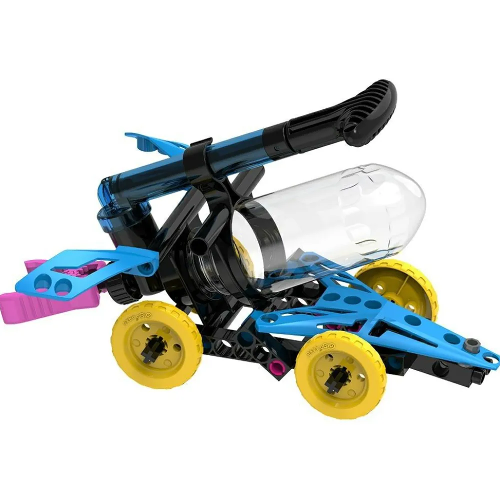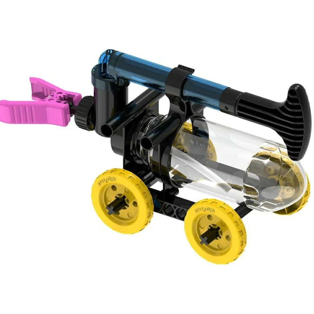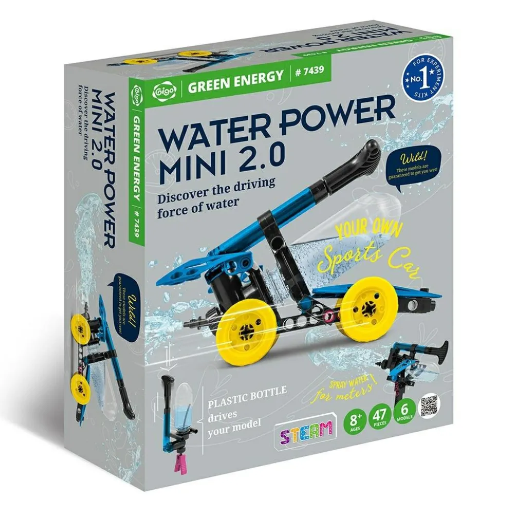 Vandkraft er en af vores ældste energikilder. Med dette byggesæt kan I bygge jeres egen vanddrevne bil, som både kan køre og snurre rundt om sig selv, mens den sprøjter vand bagud. Og så kan den også lige sejle, hvis I har noget vand i nærheden.