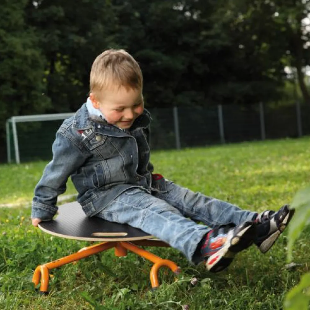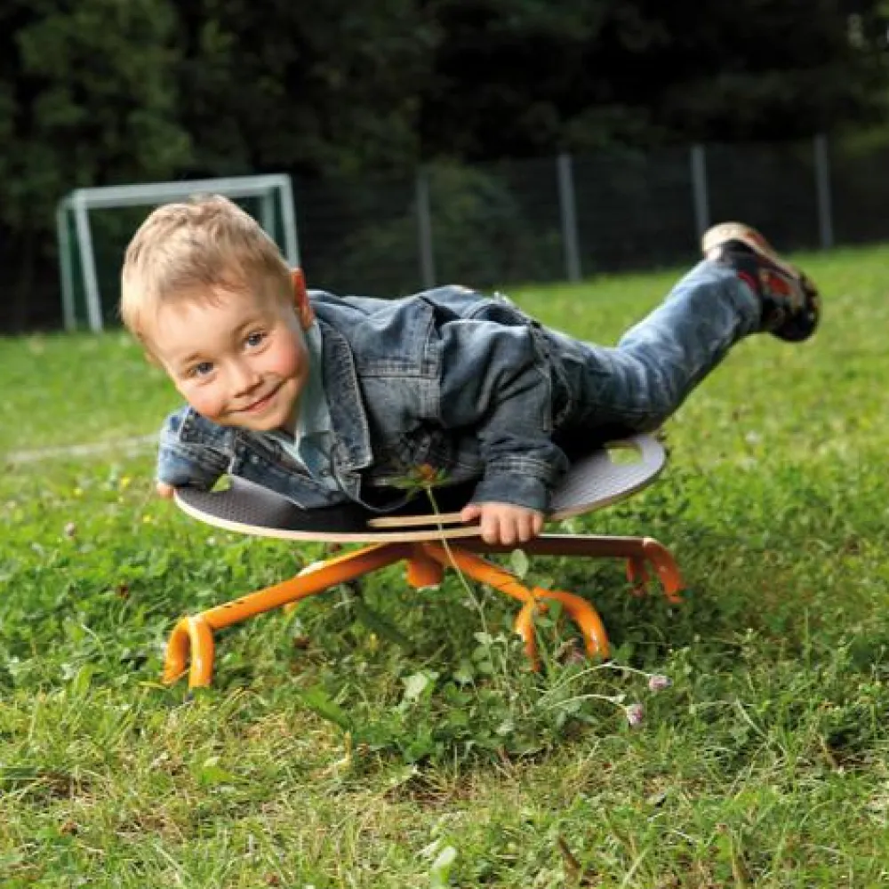 Pladen hælder lidt til siden, når kropsvægt er alt, der skal til, for at holde karrusellen i omdrejninger. Det går hurtigere og hurtigere på grund af centrifugalkraften, så hop af i tide.