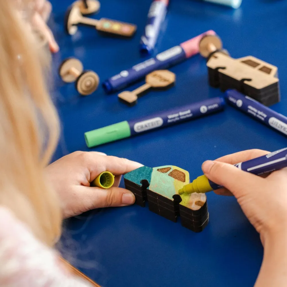 Af ufarvet træ som dit barn selv kan farvelægge med tusser, maling eller farveblyanter imens finmotorik og skrivegrebet styrkes.