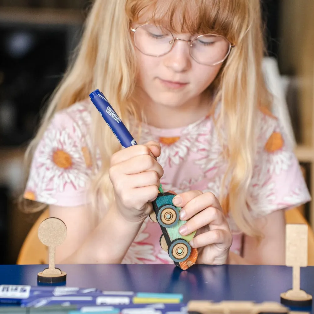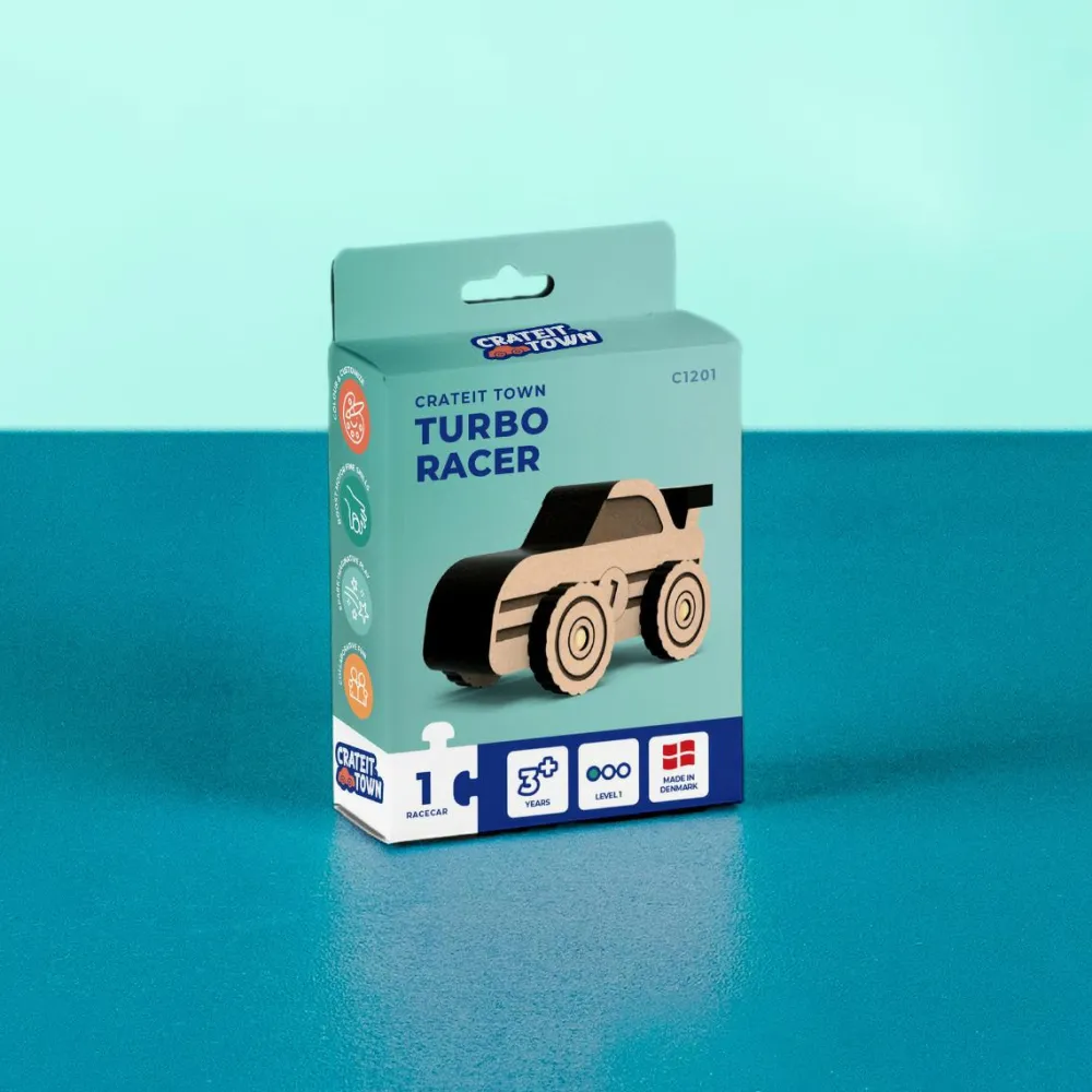 Danskproduceret trælegetøj hvor dit barn kan samle den lille bil og dekorere den i flotte farver, inden den ræser afsted i en fart.