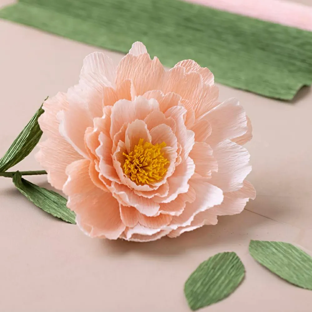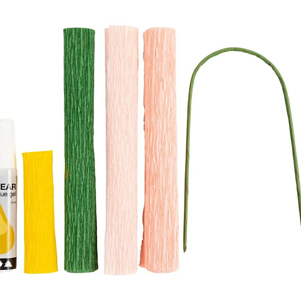 Dette kit indeholder alt, hvad der skal til for at lave en smuk pæon. Crepepapir, stængel og lim.