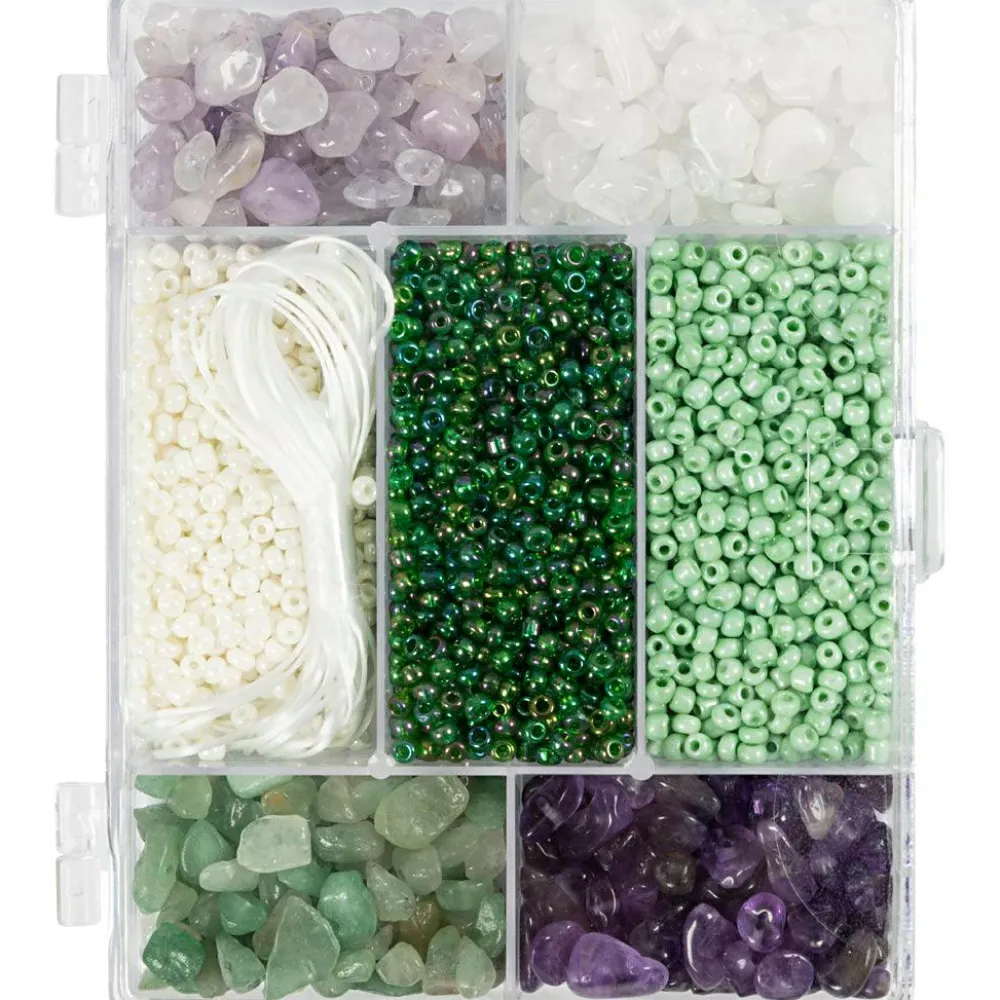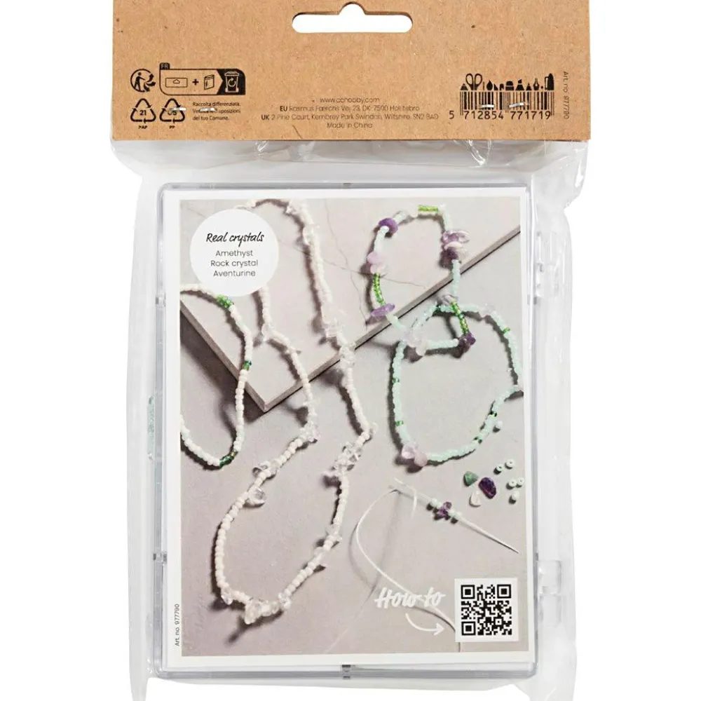 Her er krystaller (bjergkrystal, ametyst og aventurin), rocaiperler, elastiksnor og perlenål og nok til, at dit barn kan lave flere halskæder og armbånd til sig selv eller til venner eller familiemedlemmer.