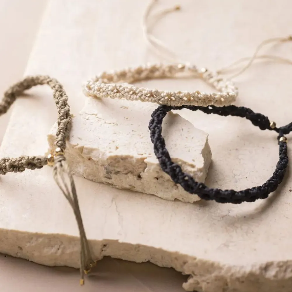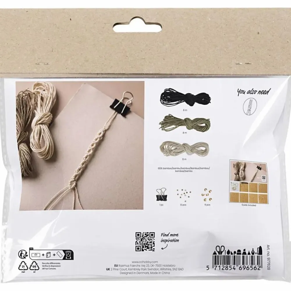Macramé er en fin knytteteknik, som dit barn og du selv kan blive ganske habile i med de fine kits. Dette sæt indeholder materialer og vejledning til 3 smukke armbånd.