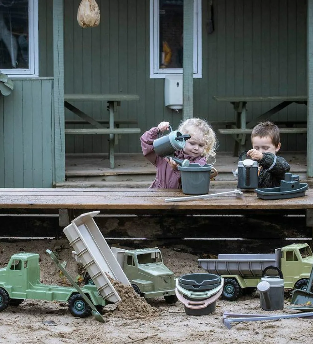 Green Bean serien fra det danske firma Dantoy er fremstillet af genanvendt, svanemærket plastik fra deres egne legetøjsproduktion. Det er omsmeltede rester, så farverne varierer.