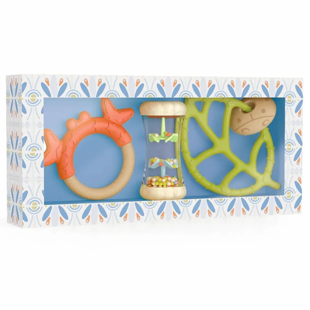 Sæt med rangler af træ og silikone, som er gode at gumle på og rasle med.