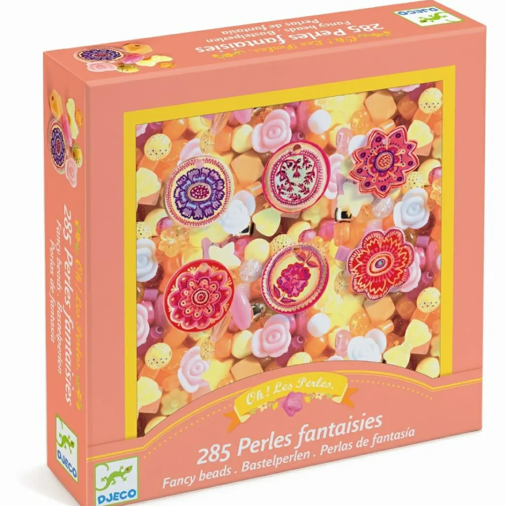 Æsken rummer i alt 285 perler, vedhæng og elastiksnor at sætte dem på, så I kan lave halskæder, armbånd eller måske en ankelkæde? Flotte kæder kan også pynte i vinduet eller på en gren fundet i gården eller skoven.