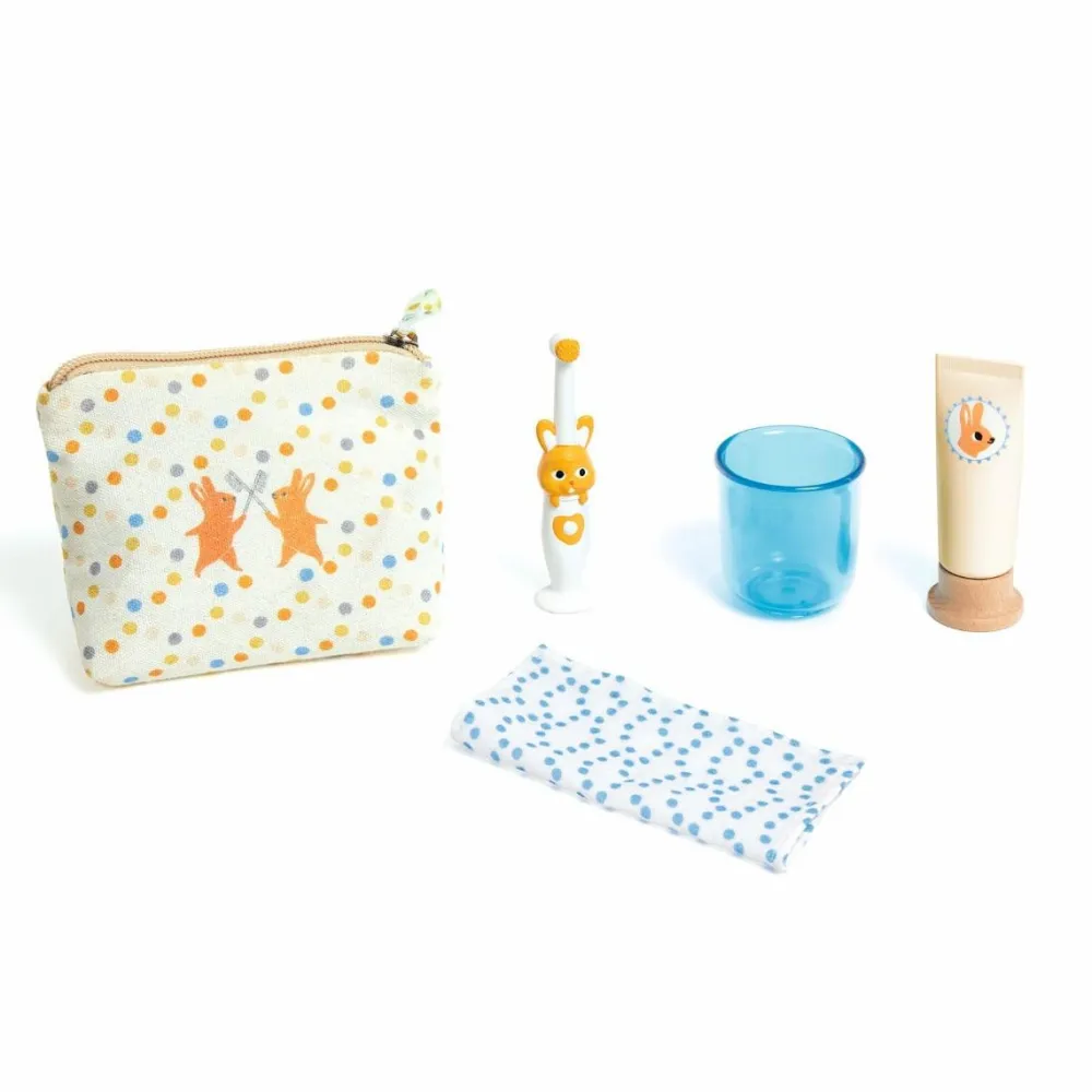 Indeholder toilettaske med tandbørste, tandpasta, tandkrus og et lille åndklæde, som dukke fx kan tørre mund i.