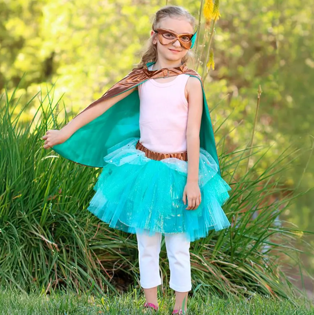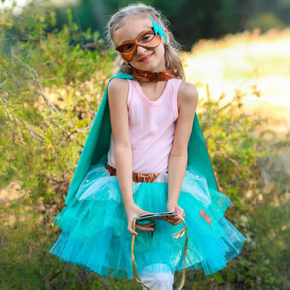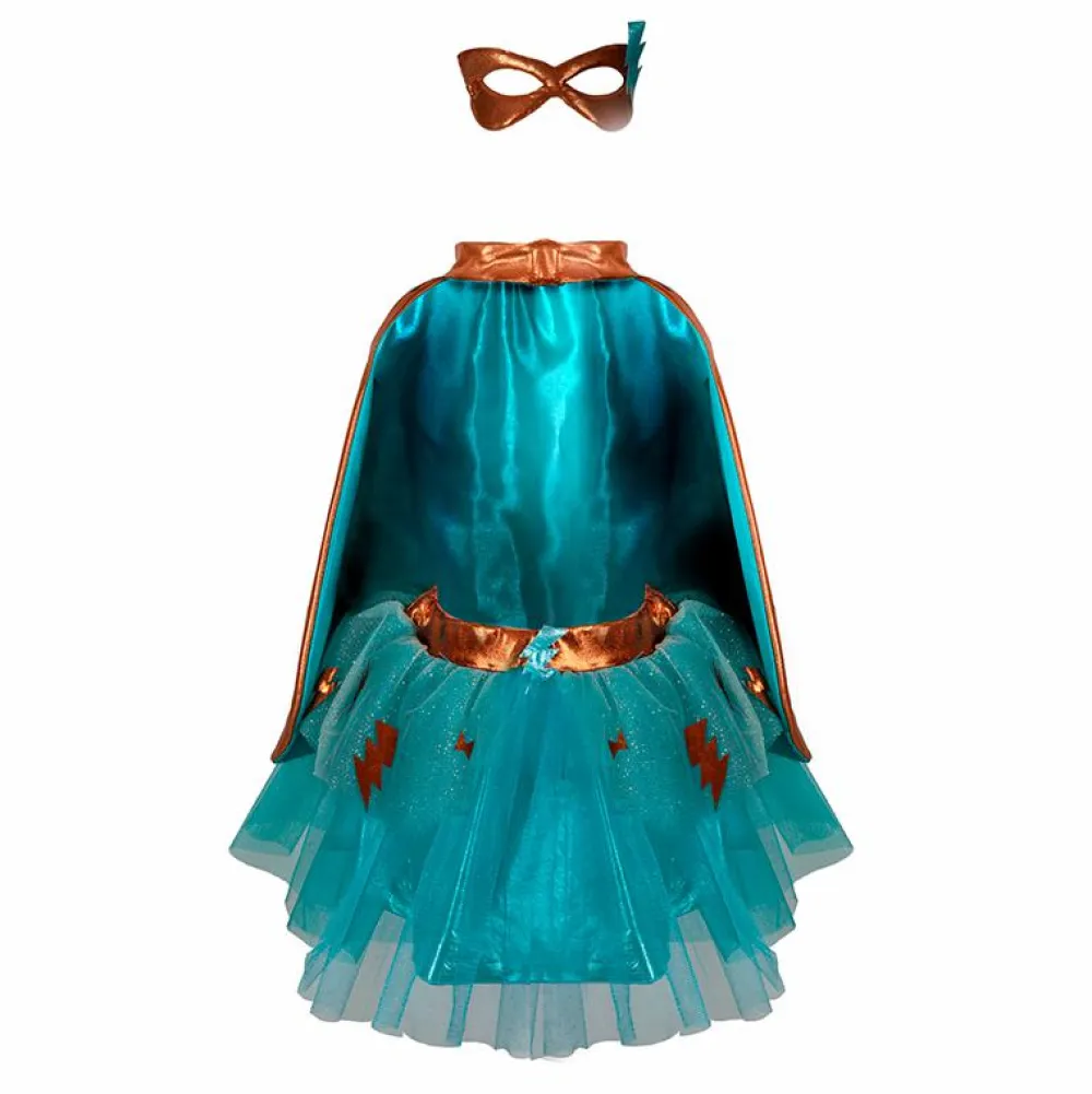 Stjerner og lyn på tyl-skørtet. Kappen kan lukkes med velcro, så dit barn selv kan tage den på, og den matcher i farven til masken.