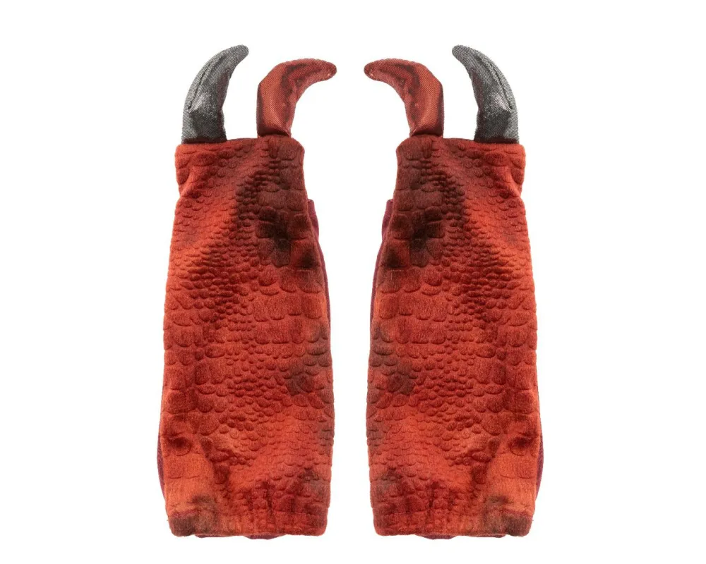 Kappe med super flotte detaljer. Hale, seje tænder, pigge ned af ryggen, flotte (og lidt farlige) øjne og lækker struktur i stoffet. Handsker med kløer følger med. Roaarr.