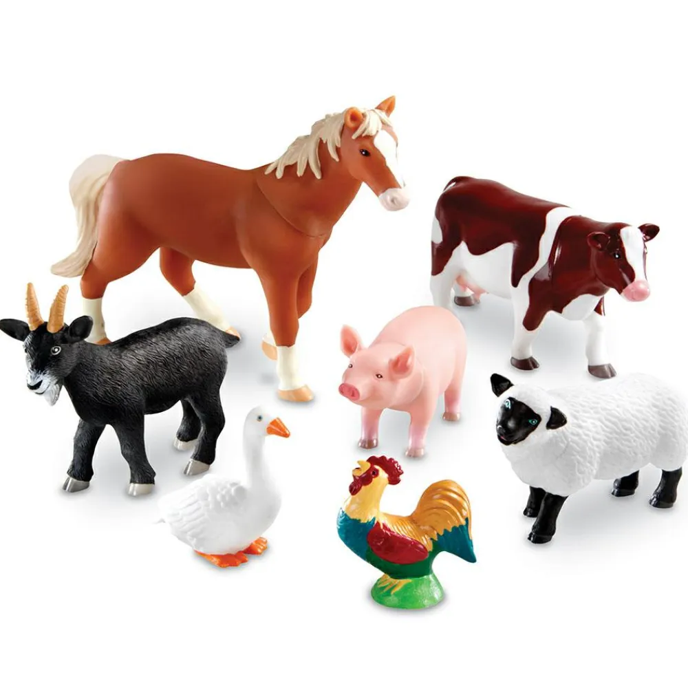 Ko, gris, hest, får, ged, gås og hane, der er klar til at flytte ind på bondegården, blive talt og navngivet eller lege bedste venner.