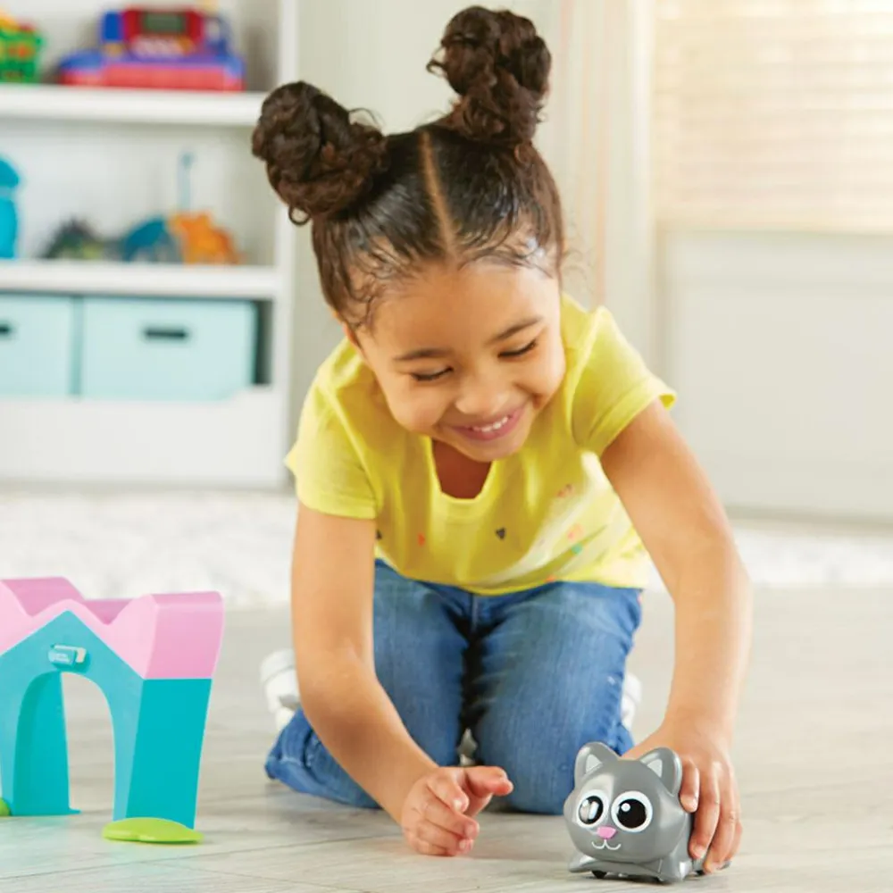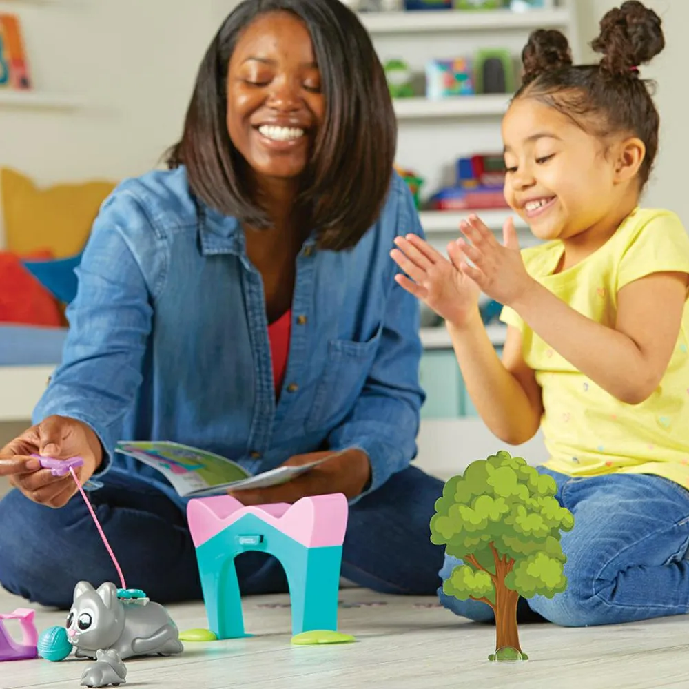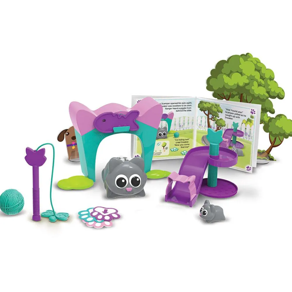 - De søde katte Scamper og Sneaker skal have hjælp fra jer til at lege sig igennem den fine fortælling, der følger med i bogform.