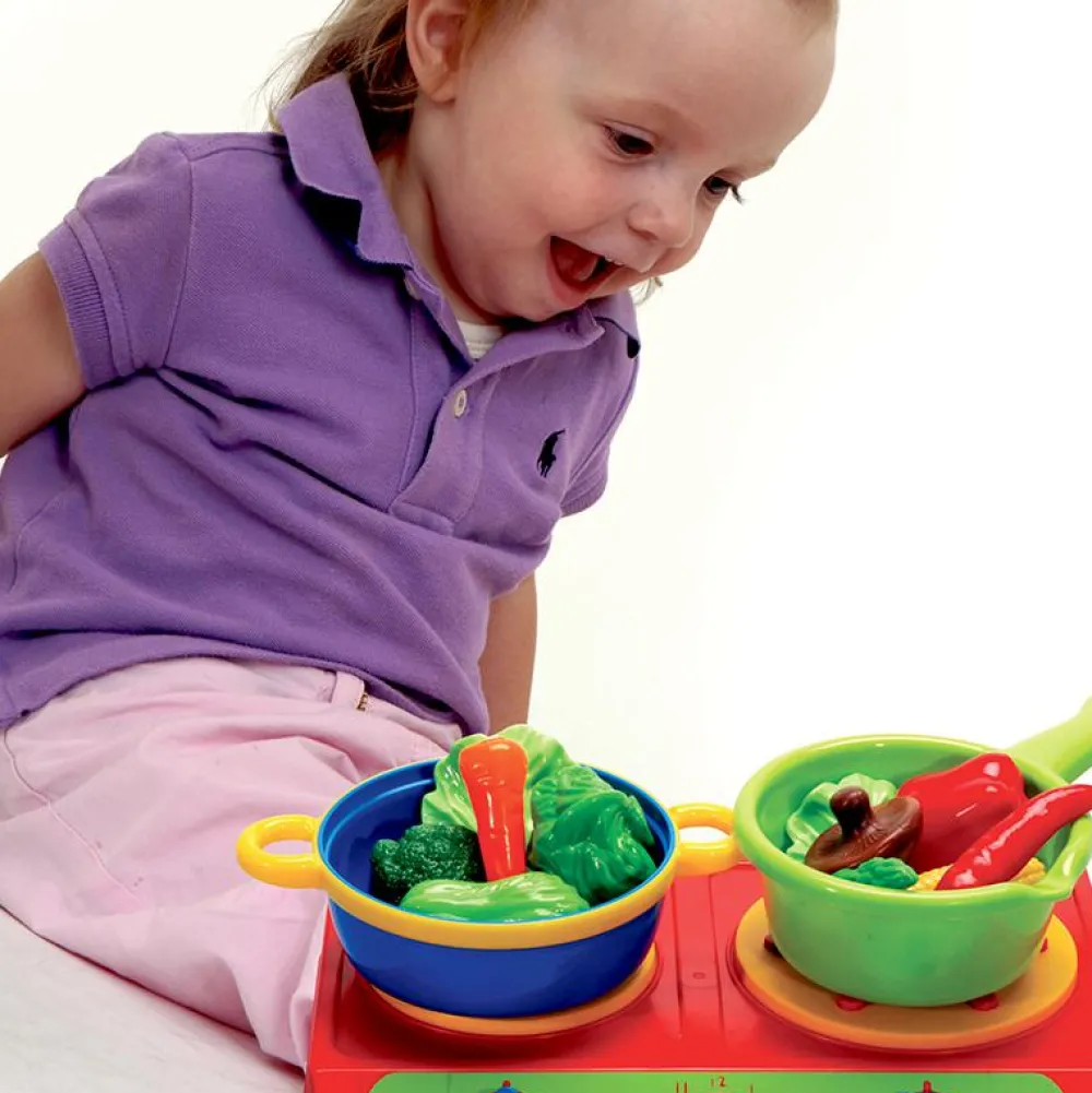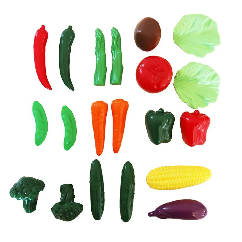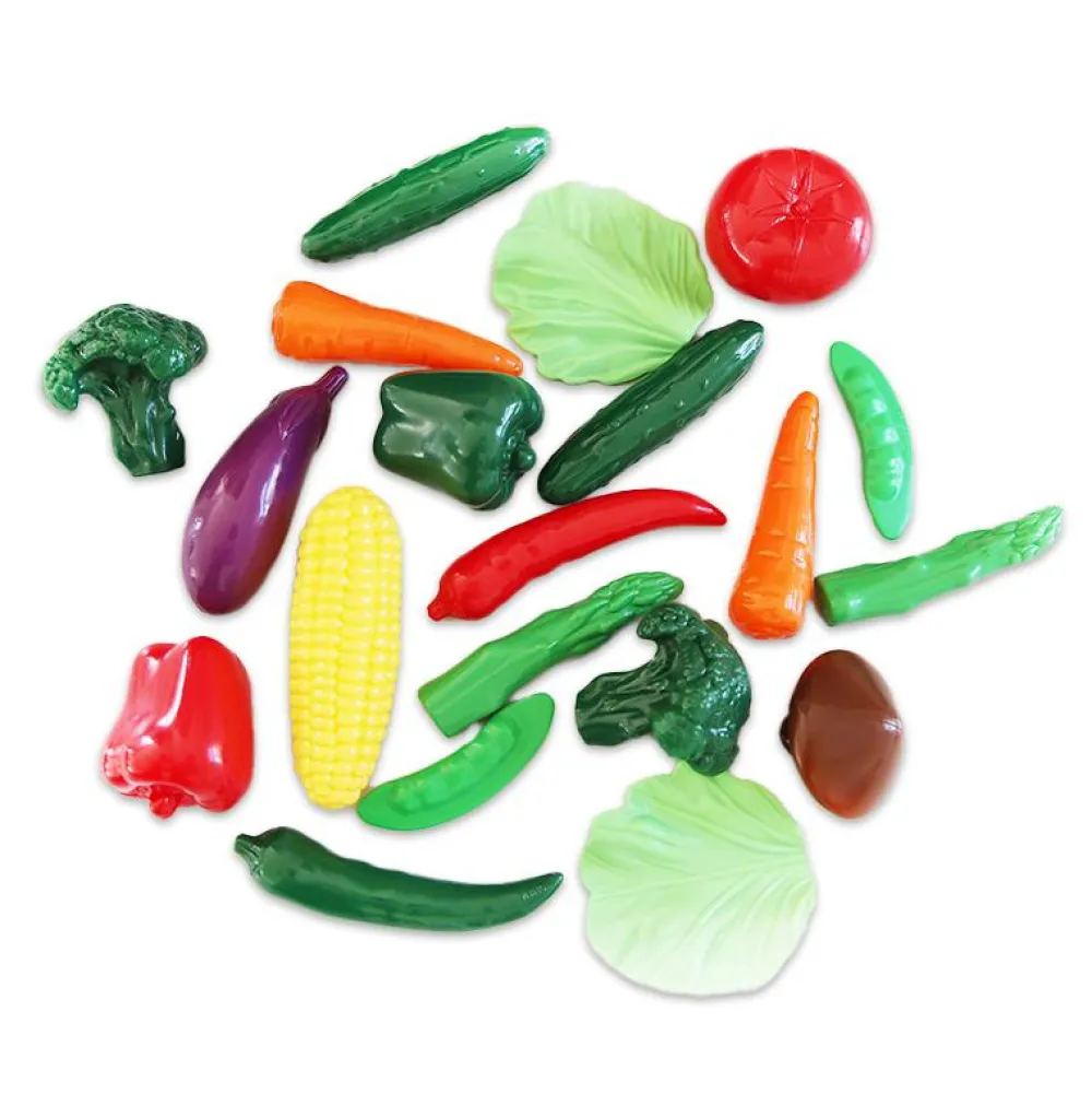 20 blandede legegrøntsager af plast som dit barn måske genkender fra ture i supermarkedet.
