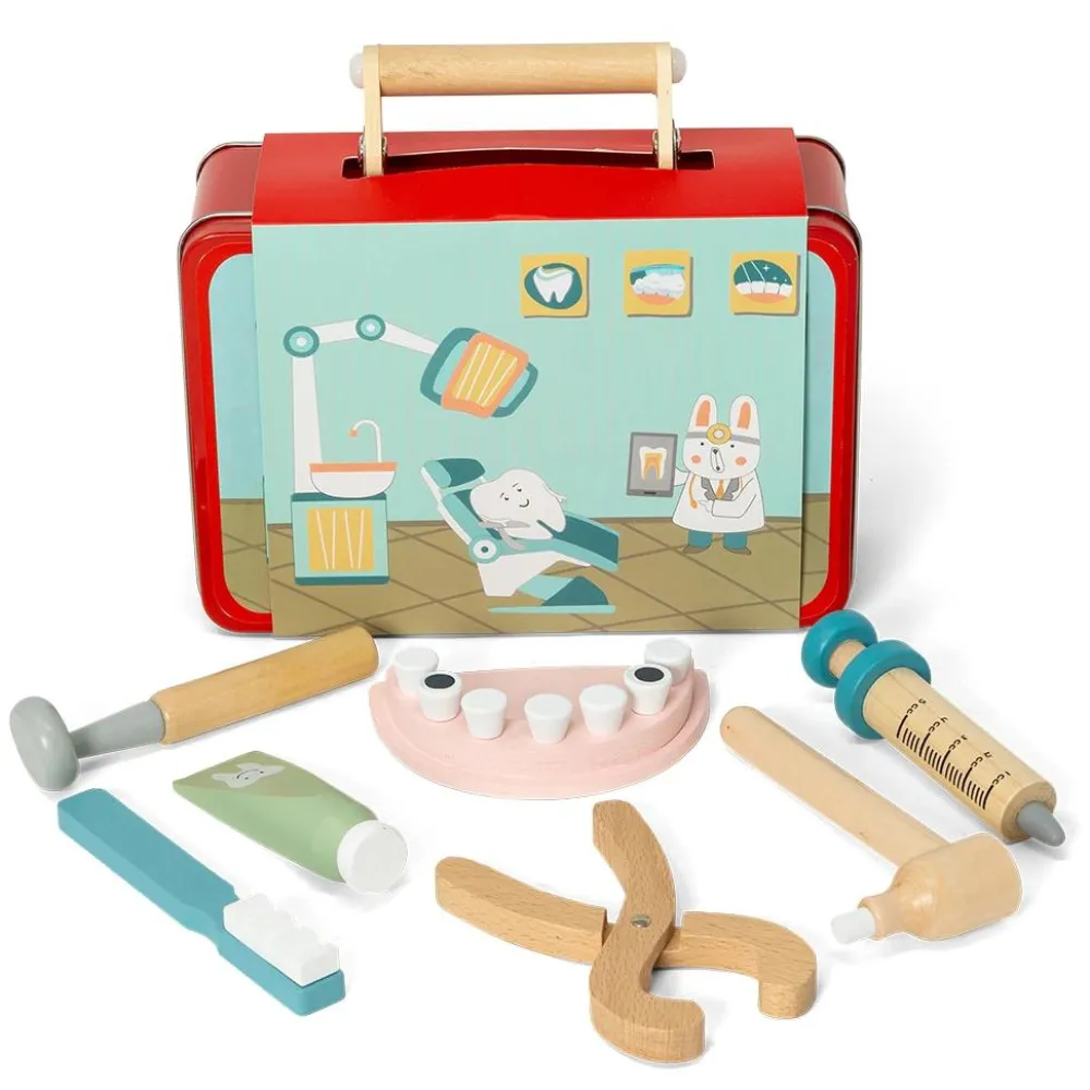 Med i sættet er der både kuffter, tandlægeredskaber og et tandsæt med både raske og ikke så raske tænder med caries.