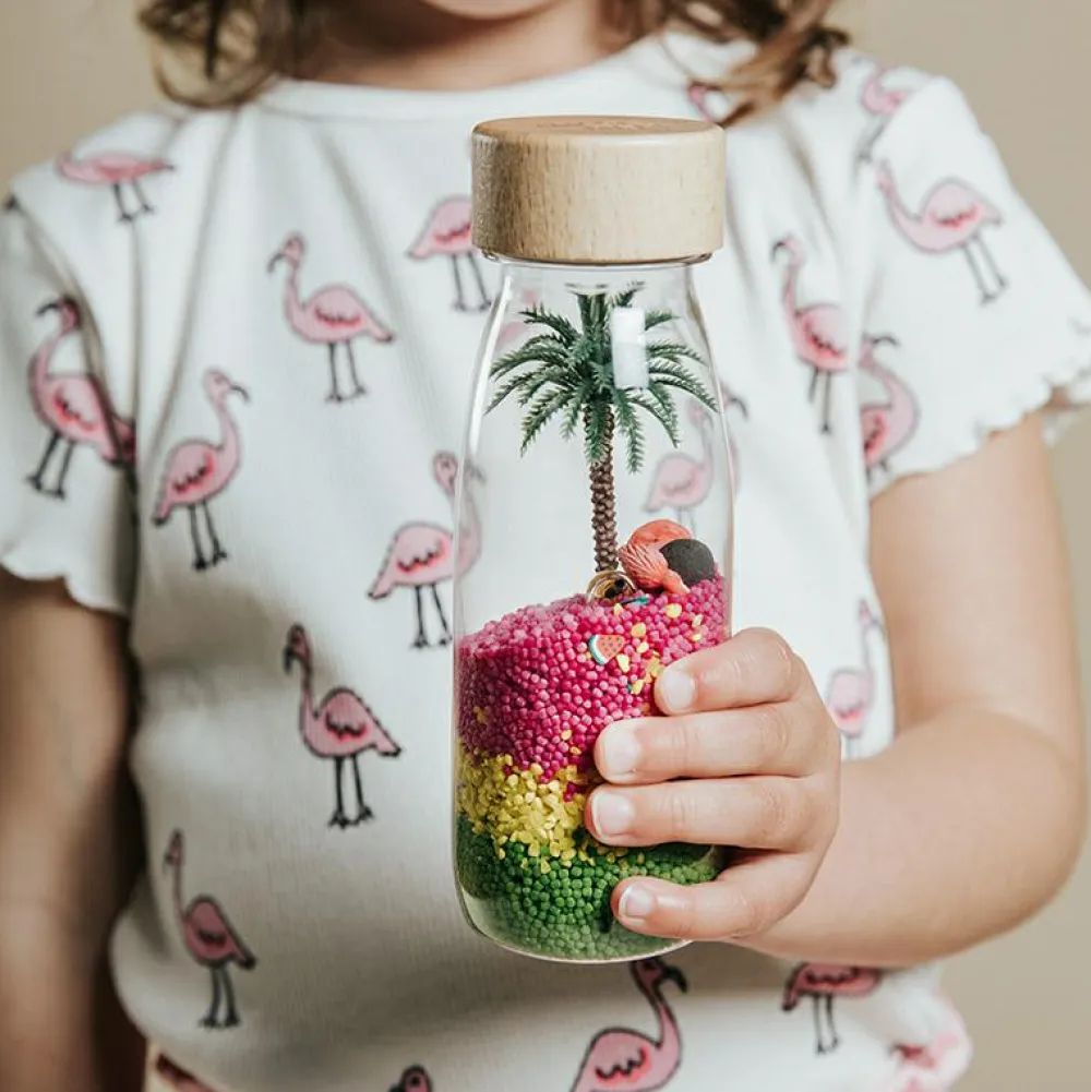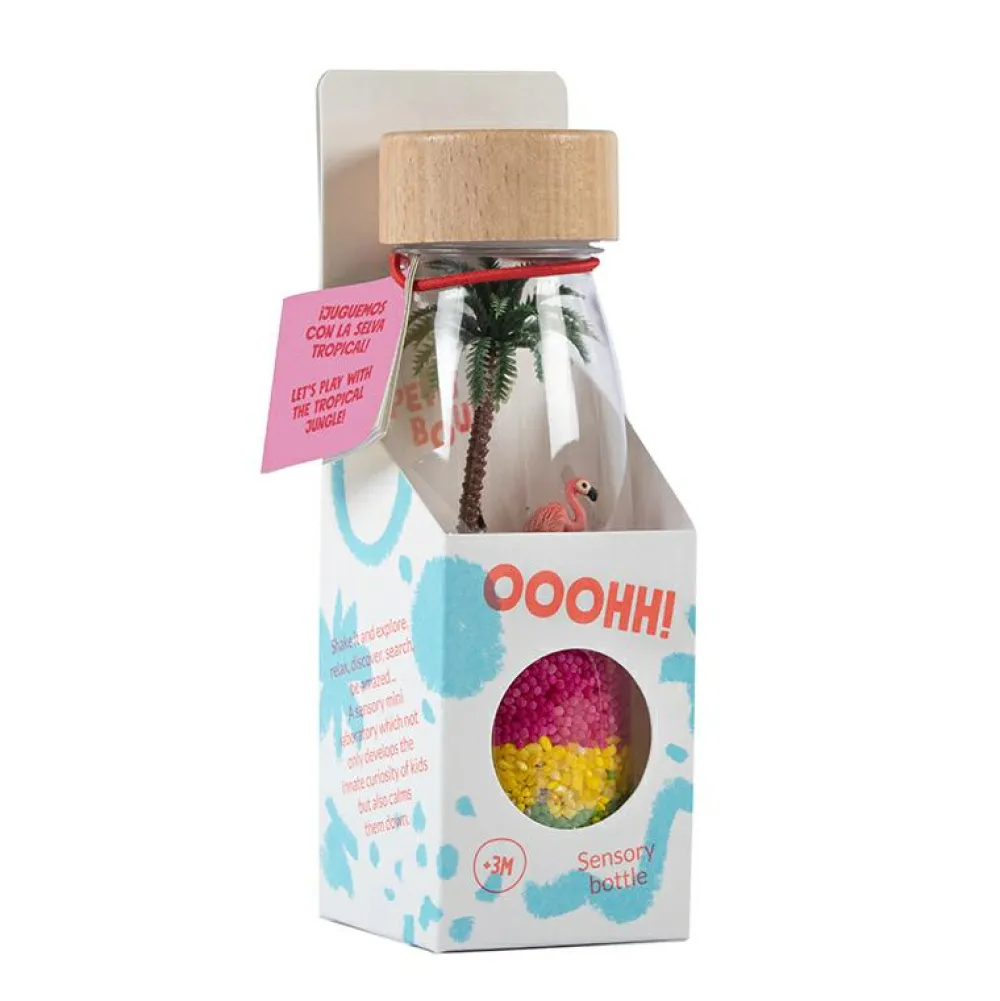 Fald til ro, kom i feriestemning og tag en pause med at vende og dreje flasken se og hør flamingoen, kokosnøden og de andre dele rasle rundt derinde.