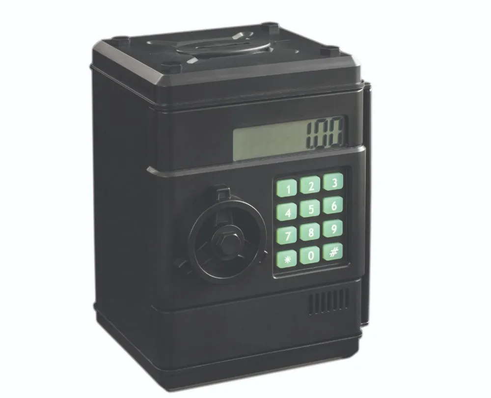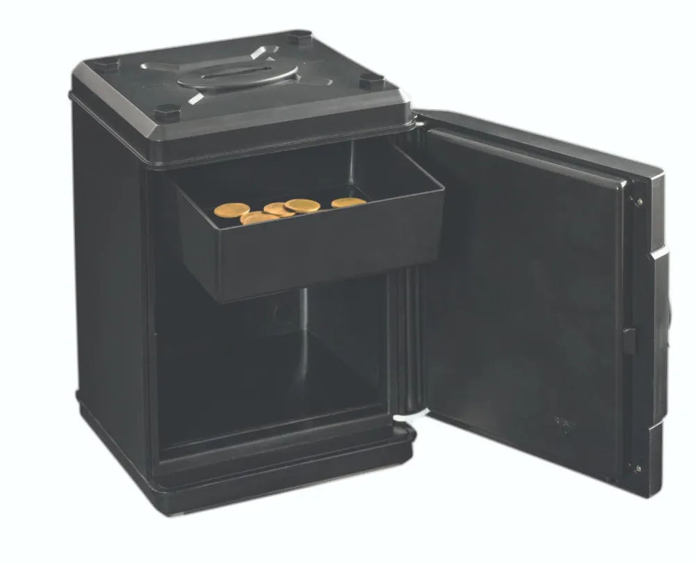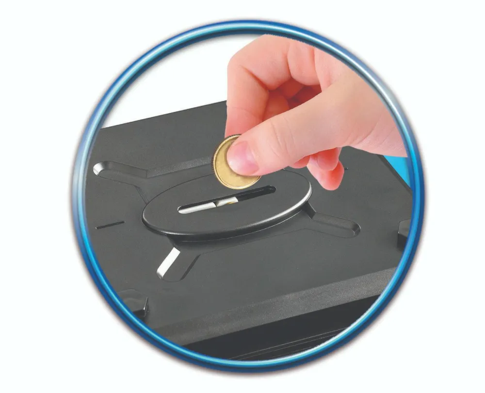 Pengeskabet har en optællingsfunktion øverst, så det tæller mønterne, når de dratter ned i pengeskabets trygge vom. Der er både en skuffe til mønter og et lille rum.