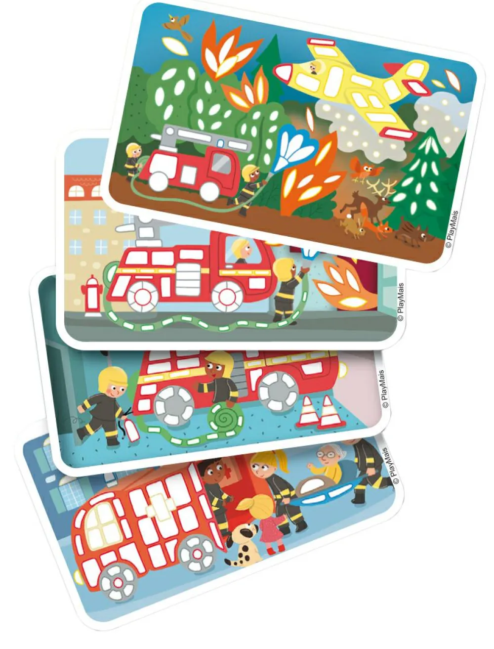Pynt de fire kort med situationer fra brandbekæmperens arbejdsdag. Eller start med at følge vejledningerne i at forme en brandbil, redningshelikopter, ambulance og indsatslederens bil.
