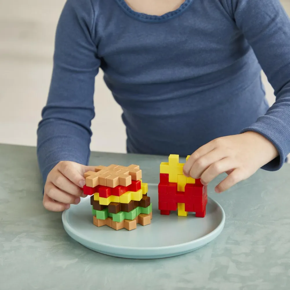 Har dit barns bamse fået lyst til burger? Så kan dit barn da lige bygge en selv ud af de store Plus-Plus brikker.