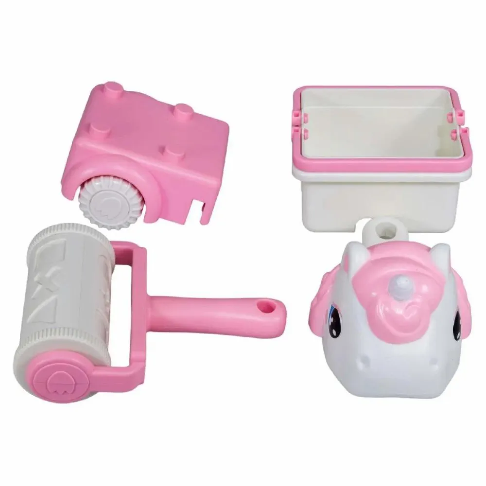 Sejt sæt, hvor dit barn kan bygge skovlen, rullen til at lave mønstre i sandet og den firkantede spandsammen så den bliver til en enhjørning-bil, som kan drøne omkring i sandet eller langs kanten af sandkassen. Det hele kommer i et net.