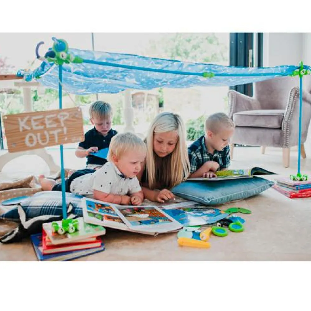 Dette telt-kit er skabt til intelligent teltbyggeri. Stole, reoler og borde kan sagtens stadig indgå i byggelegen, men som noget nyt kan dit barn som det letteste i verden, også tage fx vindueskarme og vinduer i brug. Sidstnævnte gøres ved at bruge de medfølgende sugekopper, som placeres på vinduerne, hvorefter lagnet sættes fast.