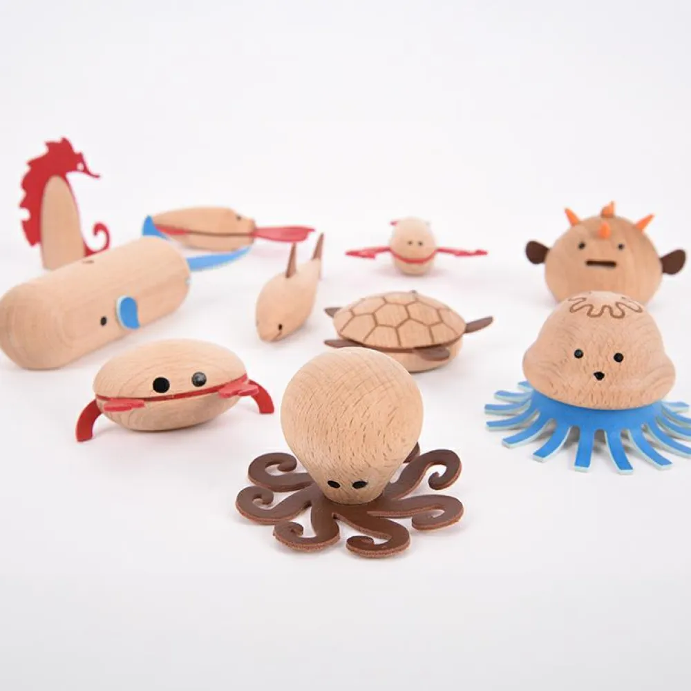 Sjove robuste havdyr af massivt bøgetræ med detaljer af blødt kunstlæder.