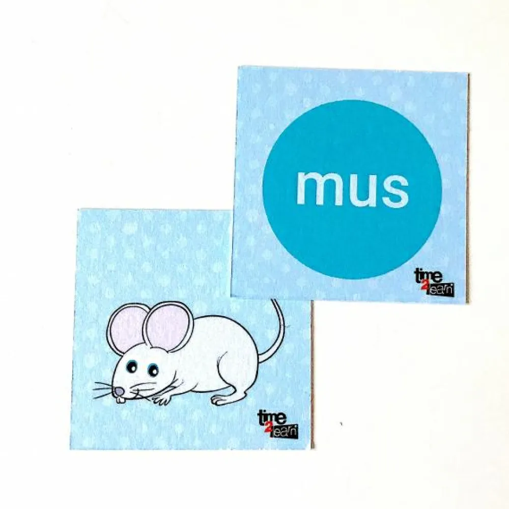 I stedet for at matche 2 billedkort, skal dit barn matche et ordkort og et billedkort. Formålet er at lære dit barn bogstavlydene og at sige dem i den rigtige rækkefølge. Så de danner velkendte ord.