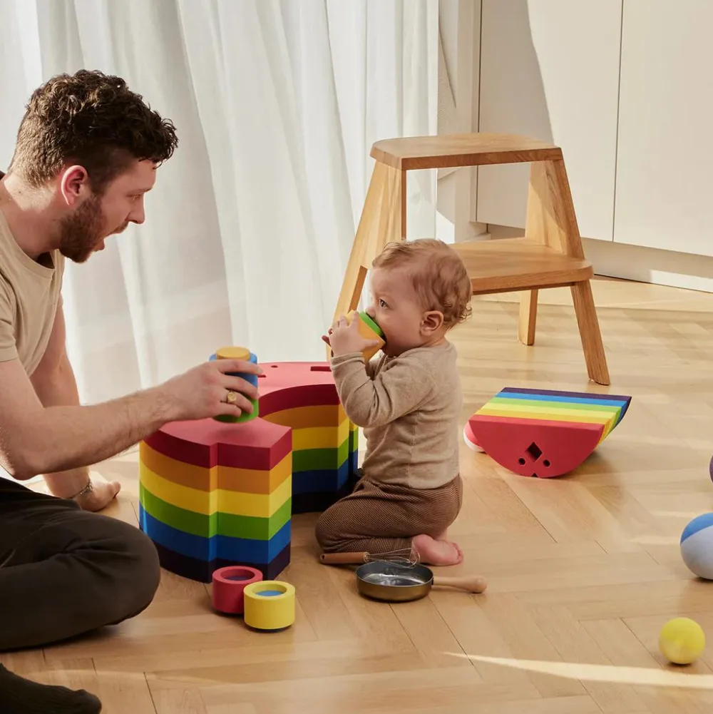 Den er meget alsidig og følger dit barn fra de tidligste år, hvor baby kan ligge på maven og gynge, mens du holder godt fast i babys små ben, og til der er brug for en skammel eller en vippe senere hen.