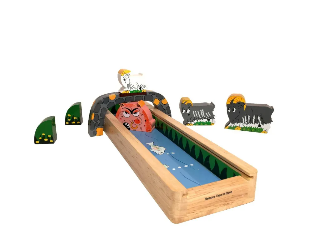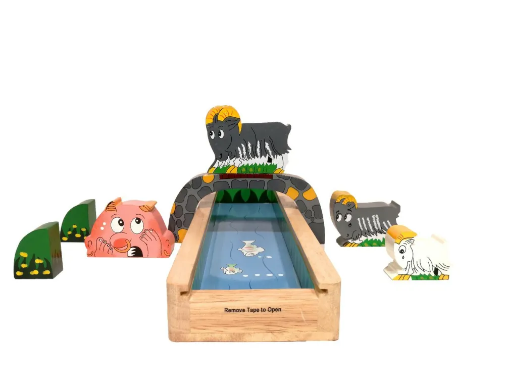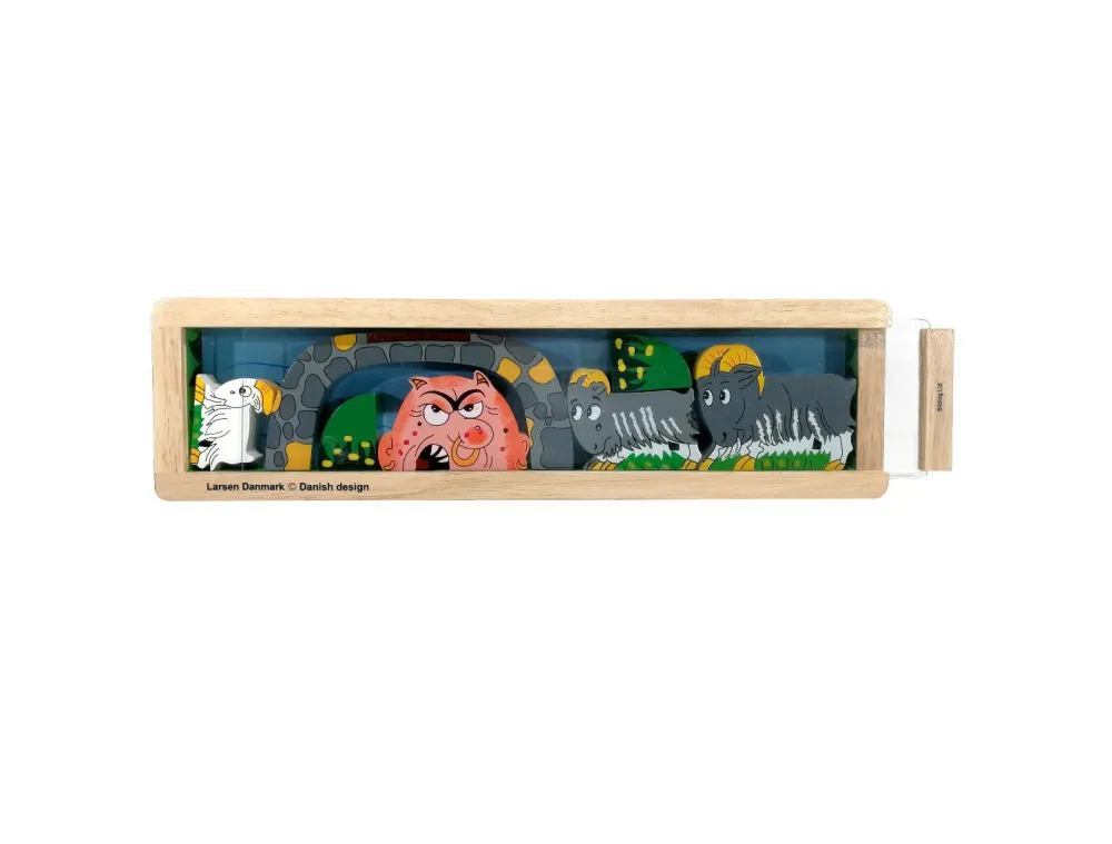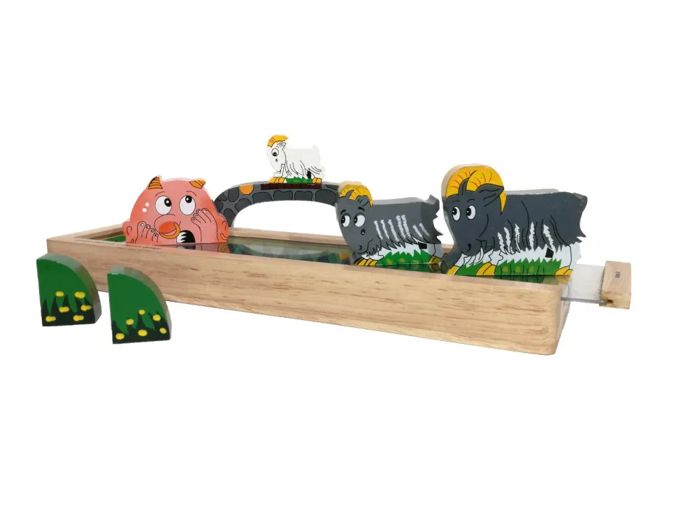 Skønne eventyrklodser af træ med blank overflade og flotte farver, som bringer det norske folkeeventyr om De Tre Bukke Bruse til live for børn helt ned til vuggestuealderen og til indskolingen.