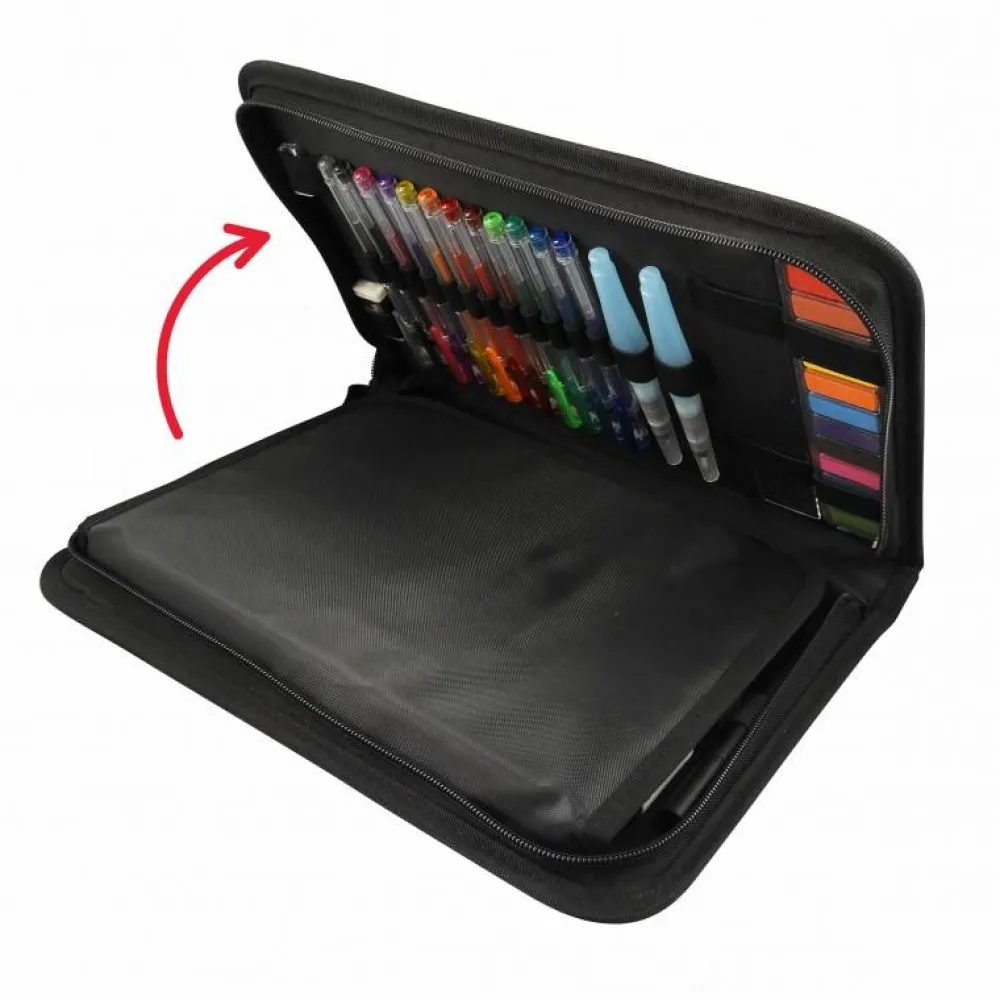 Mappen lukkes med lynlås og har praktisk håndtag.